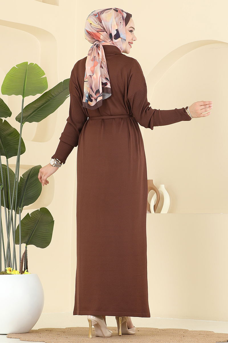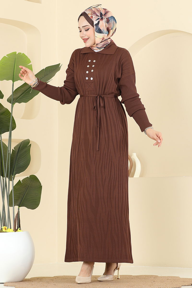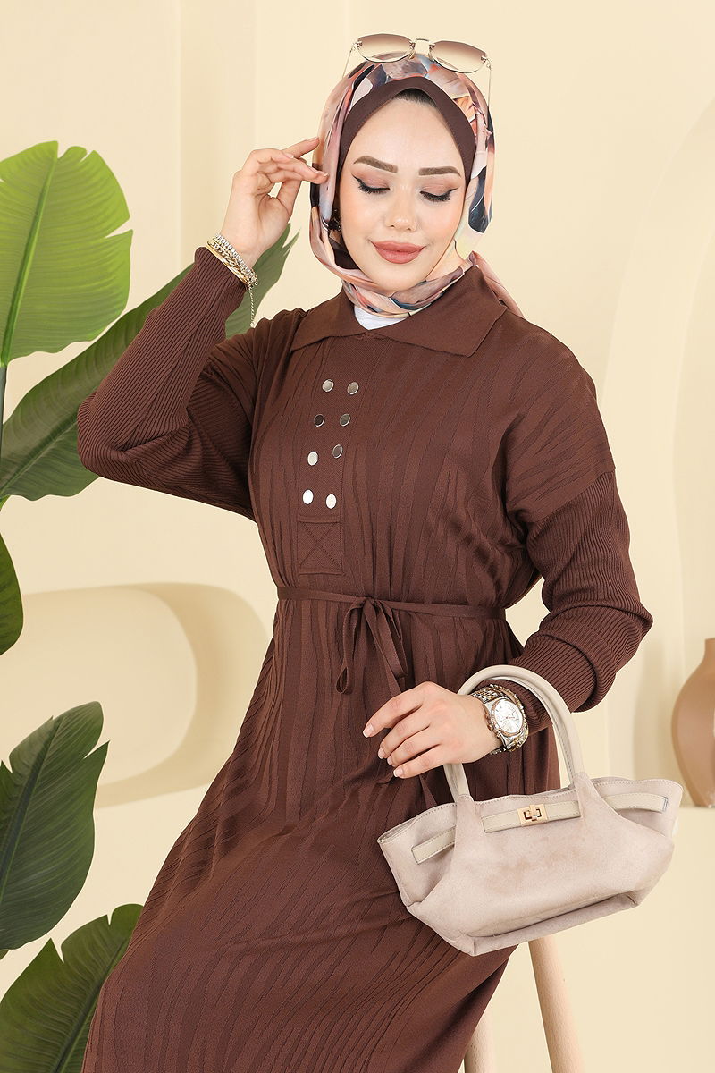 Aksesuar Düğmeli Triko Elbise 211440TPK1167 Kahve