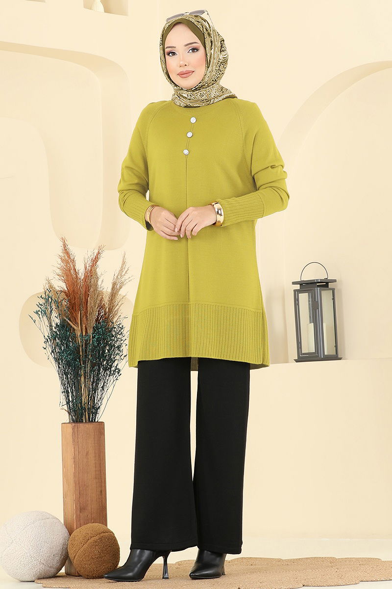 Akıllı ve şık bir tercih olan Aksesuarlı Düğmeli Triko Takım, sonbahar ve kış aylarınızı ısıtmak için tasarlandı. Hassas yıkama özelliği ve 30 derecede yıkanabilme kolaylığı sunan bu tesettür ürünü, rahatlığı ve şıklığı bir arada sunuyor. Triko kumaştan üretilen set, bisiklet yaka tunik ve lastik bel pantolondan oluşuyor. Aksesuar olarak eklenen düğmelerle stilinizi tamamlayın.