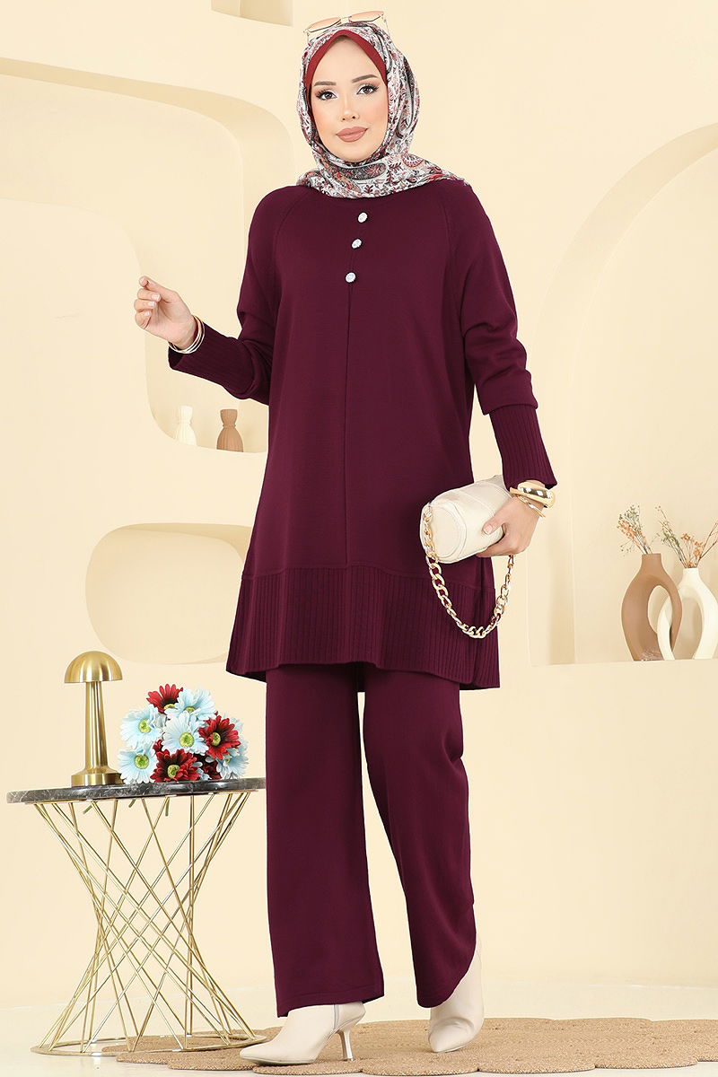 Akıllı ve şık bir tercih olan Aksesuarlı Düğmeli Triko Takım, sonbahar ve kış aylarınızı ısıtmak için tasarlandı. Hassas yıkama özelliği ve 30 derecede yıkanabilme kolaylığı sunan bu tesettür ürünü, rahatlığı ve şıklığı bir arada sunuyor. Triko kumaştan üretilen set, bisiklet yaka tunik ve lastik bel pantolondan oluşuyor. Aksesuar olarak eklenen düğmelerle stilinizi tamamlayın.