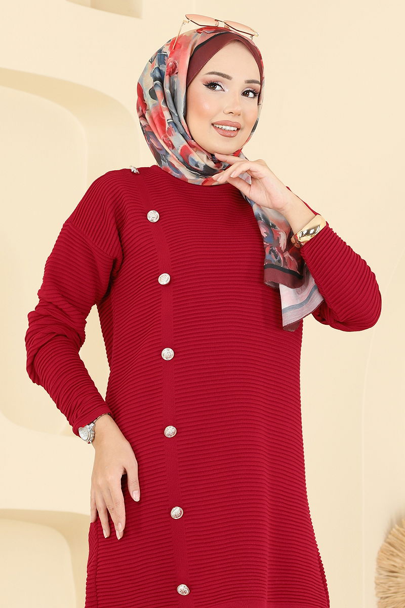 Aksesuar Düğmeli Triko Tunik Kırmızı
