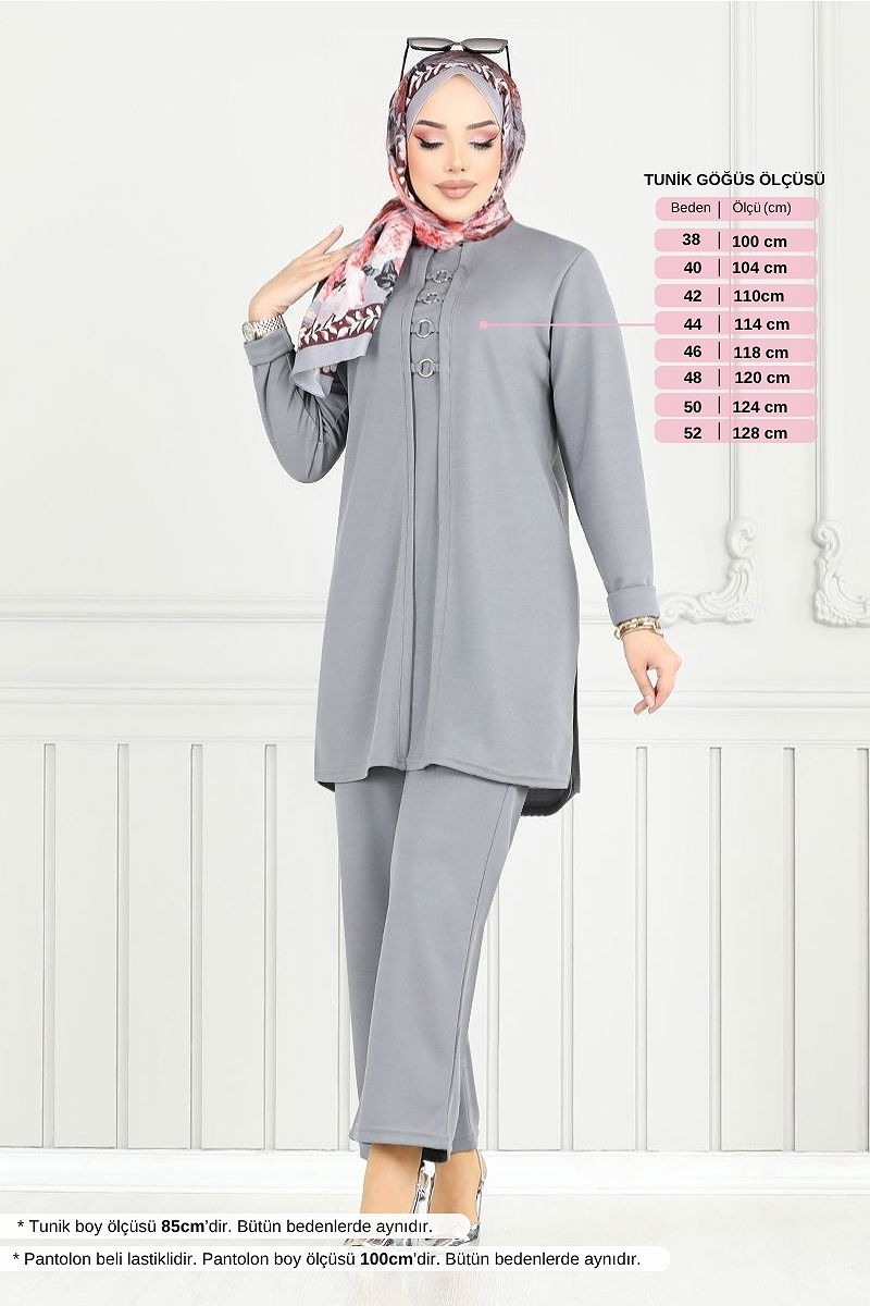 Modern ve şık bir seçim olan Aksesuar Halkalı Takım kombin, dört mevsim rahatlıkla kullanabileceğiniz özel bir tesettür ürünüdür. Hassas yıkama ile 30 derecede yıkanabilen bu takım, krep kumaştan üretilmiştir ve üstün konfor sunar. Metal aksesuarları kararmaz, bisiklet yaka tunik ve elastik bel pantolon tasarımıyla gün boyu rahatlık sağlar. Modelin üzerindeki ürün 38 bedendir.