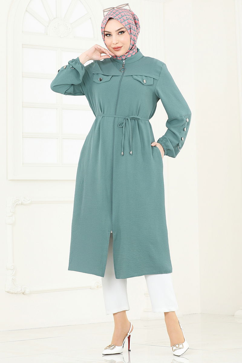 Ürün Özelliği : Yeni sezon tesettür moda ürünüdür. Ürün Yarım Hakim yakadır. Astarsızdır. Ürün Önden fermuarlıdır. Düğmeler aksesuardır. Kemer ürüne dahildir, isteğe bağlı kullanılmayabilir. Yan Cep mevcuttur.Göğüs cep aksesduardır. Manşet lastiklidir. Konsept fotoğraf çekimlerinden dolayı üründe ton farklılığı olabilir.