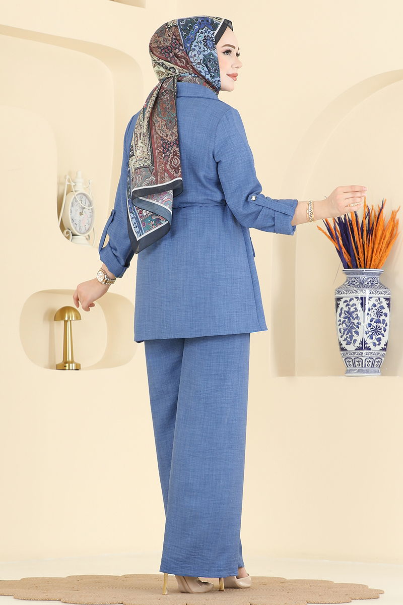 Ürün Özelliği : Yeni sezon tesettür moda ürünüdür. Beli bağcıklıdır. Ürün Ceket yakadır. Astarsızdır. Cep detayı aksesuardır. Pantolon beli lastiklidir. Manşet apolet düğmeleri aktiftir. Konsept fotoğraf çekimlerinden dolayı üründe ton farklılığı olabilir.