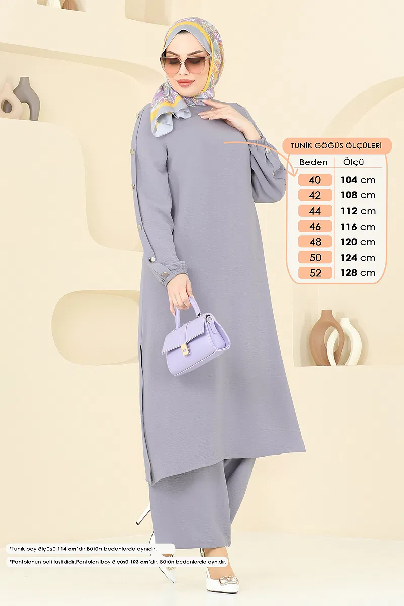 Ürün Özelliği : Yeni sezon tesettür moda ürünüdür. Sırttan kullanılabilir bir düğmesi bulunmaktadır. Ürün Bisiklet yakadır. Tunik yandan yırtmaçlıdır.. Astarsızdır. Düğmeler aksesuardır. Pantolon beli lastiklidir. Manşet lastiklidir. Konsept fotoğraf çekimlerinden dolayı üründe ton farklılığı olabilir.