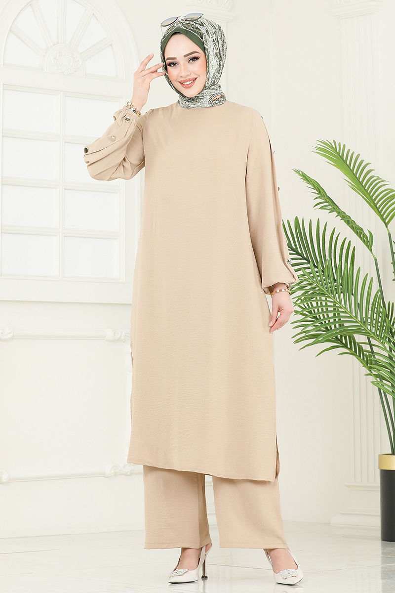 The Apolet Buttoned Hijab Suit is a hijab clothing item that stands out for its all-season comfort. Made from aerobin fabric, this special design is suitable for gentle wash at 30 degrees and offers long-lasting use. With its crew neck and unlined structure, it has a modern look, while the button detail at the back provides practical usage. The elastic waist and cuffs of the pants ensure a comfortable fit. Offering both elegance and comfort, this suit allows you to create a stylish style in any setting.