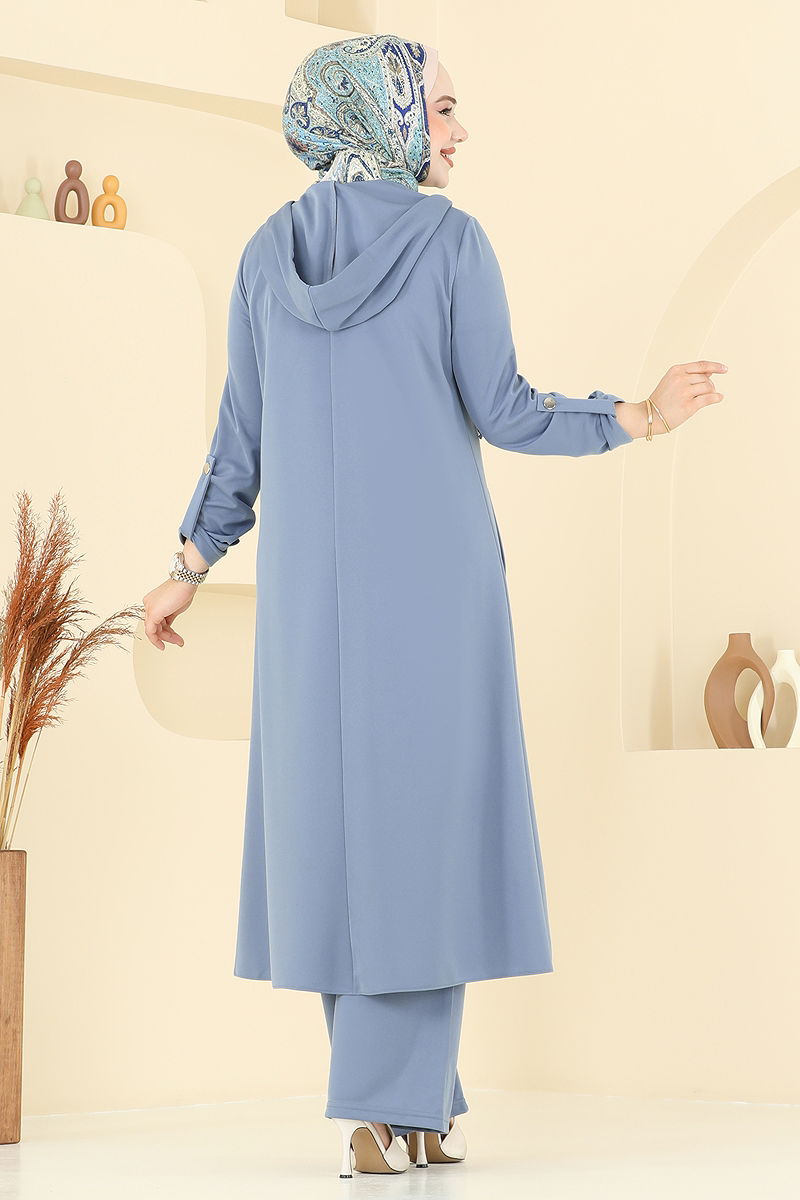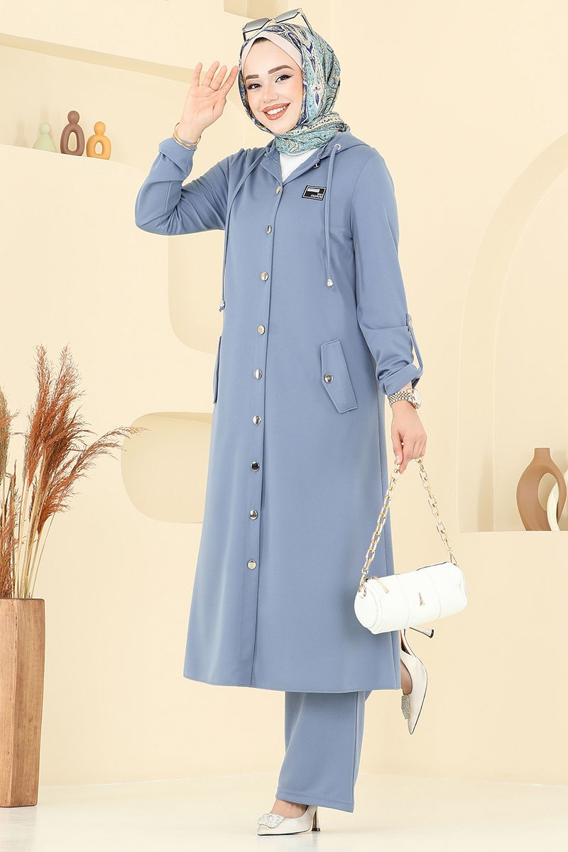 Ürün Özelliği : Yeni sezon tesettür moda ürünüdür. Ürün Kapşonlu yakadır. Ürün Önden düğmelidir. Astarsızdır. Arma detayı dikilidir. Kapşon ürüne dikilidir. Bağcık detayları aksesuardır. Bluz ürüne dahil değildir. Ürün kullanım amacını göstermek için bluz ile örnek kombin yapılmıştır. Cep mevcuttur. Pantolon beli lastiklidir. Manşet düğmeleri aktiftir. Konsept fotoğraf çekimlerinden dolayı üründe ton farklılığı olabilir.