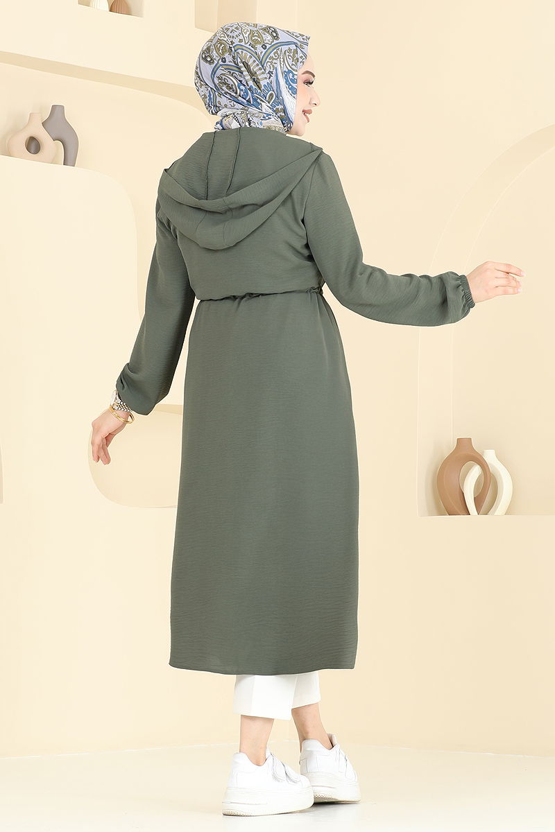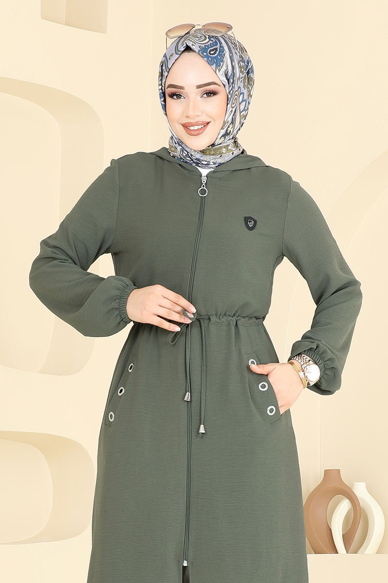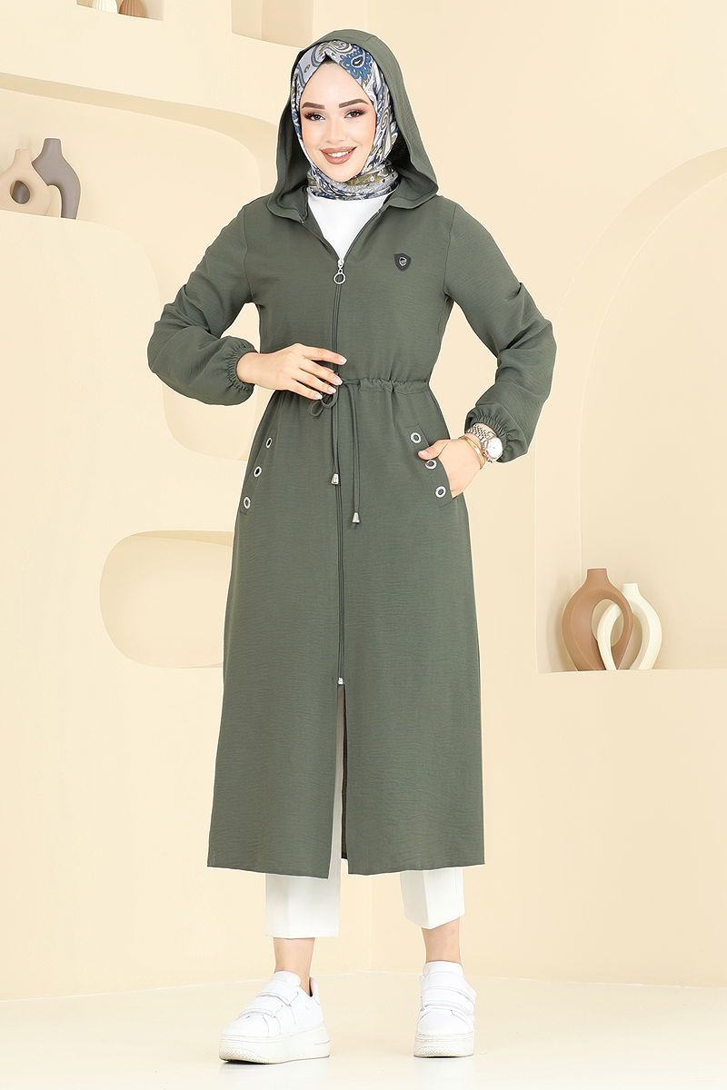 Arma Detaylı Mevsimlik Kap. Bu şık modeli, tesettür tarzında dört mevsim rahatlıkla kullanılabilir. Aerobin kumaştan üretilmiş olan bu kap, hafif ve nefes alabilir özelliktedir. Kapşonlu tasarımıyla modern bir görünüm sunarken, astarsız yapısı ile maksimum konfor sağlar. Pratik kullanım için önden fermuarlıdır ve ayarlanabilir bağcıklı bel kısmı ile ideal oturumu garantiler. Şık arma detayları ve baskılı zımba tasarımları ile dikkat çekicidir. Kapşona eklenen cepler ve manşetlerdeki lastik detayları ise fonksiyonelliği artırır. Modelin üzerindeki ürün 38 bedendir.