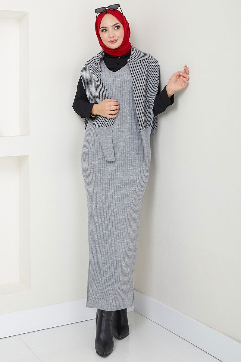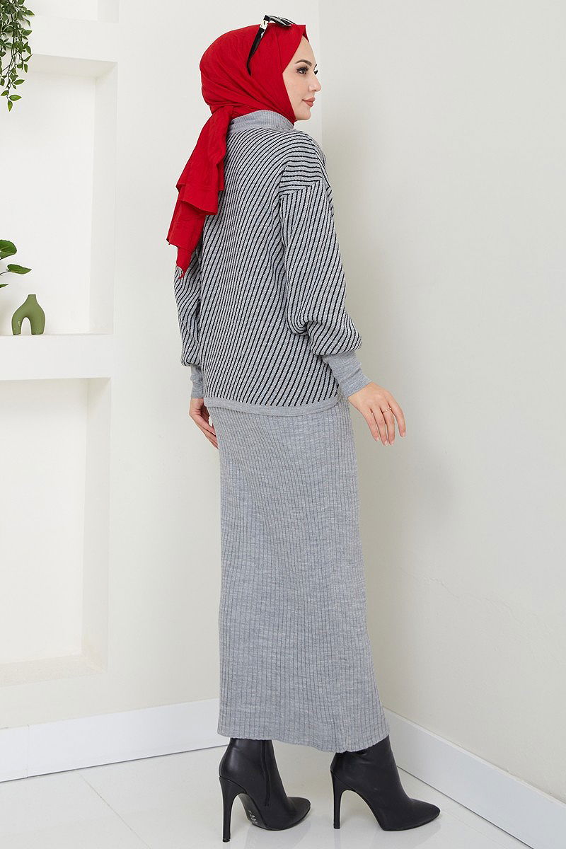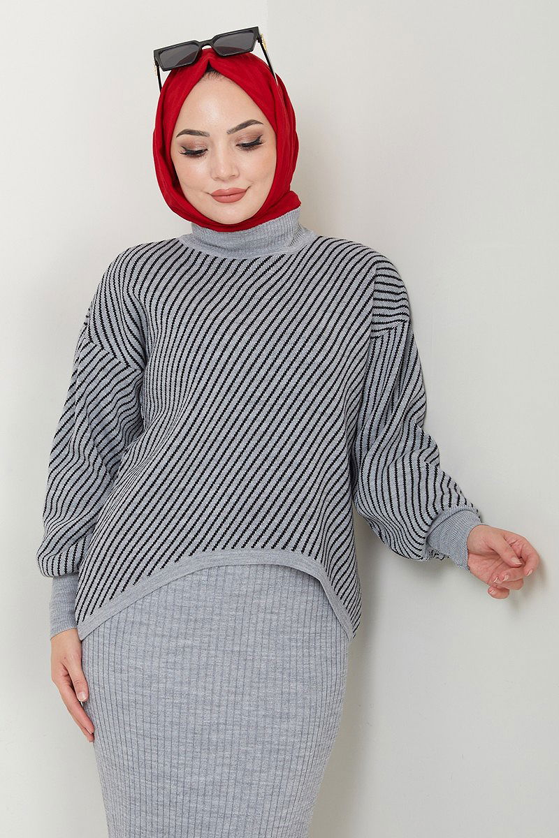 Asimetrik Çizgili Kazaklı Takım model tesettür ürünüdür. Sonbahar ve Kış sezonunda kullanılabilir. 30 derecede sıkma yapılmadan yıkanmalıdır. Birinci sınıf Triko kumaştan imal edilmiştir. Ürün Yarım Boğaz yakadır ve astarsızdır. Modelin üzerindeki ürün 38 bedendir. Boy: 160 cm, Göğüs: 86 cm, Bel: 68 cm, Basen: 95 cm, Kilo: 52 kg. İç elbise kafadan giyilmektedir ve kolsuzdur.