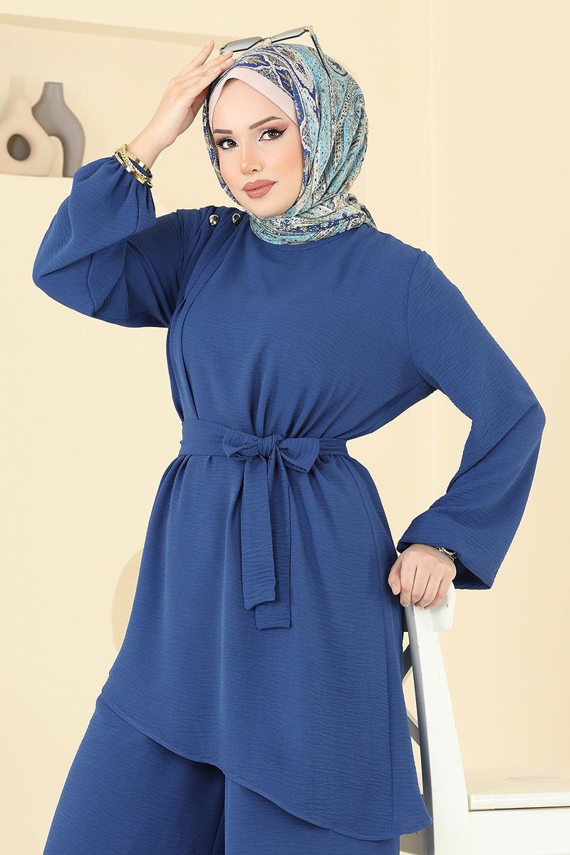 Ürün Özelliği : Yeni sezon tesettür moda ürünüdür. Sırttan kullanılabilir bir düğmesi bulunmaktadır. Ürün Bisiklet yakadır. Astarsızdır. Düğmeler aksesuardır. Kemer ürüne dahildir, isteğe bağlı kullanılmayabilir. Pantolon beli lastiklidir. Manşet lastiklidir. Konsept fotoğraf çekimlerinden dolayı üründe ton farklılığı olabilir.