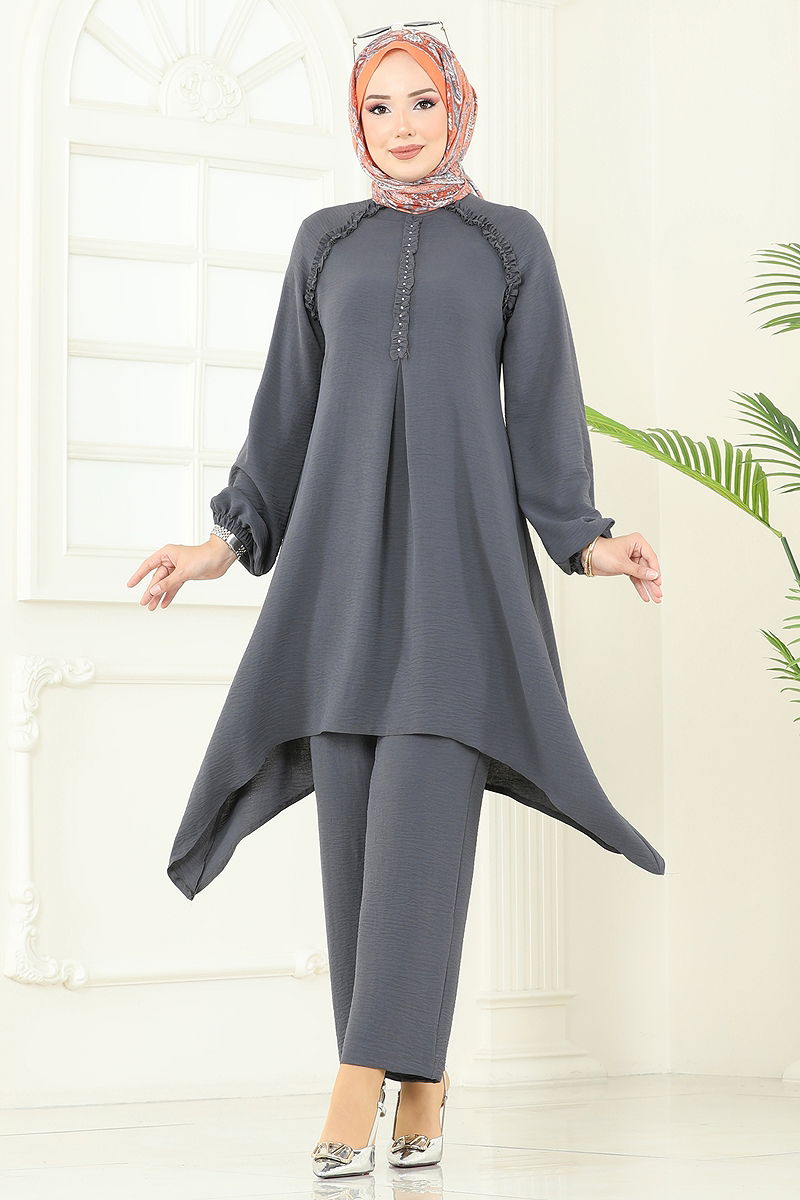 Asimetrik Kesim Aerobin Takım, tesettür modasına özel tasarlanmıştır. Dört mevsim rahatlıkla kullanılabilir özellikleriyle ön plana çıkar. 30 derecede hassas yıkama programında yıkanabilen bu ürün, aerobin kumaştan üretilmiştir. Bisiklet yaka ve astarsız tasarımıyla modern bir görünüm sunar. Tunik ve pantolonun elastik manşetleri, konforu artırırken, sırt kısmındaki düğme detayı şıklığı tamamlar. Pantolonun lastikli beli ise gün boyu rahat etmenizi sağlar.