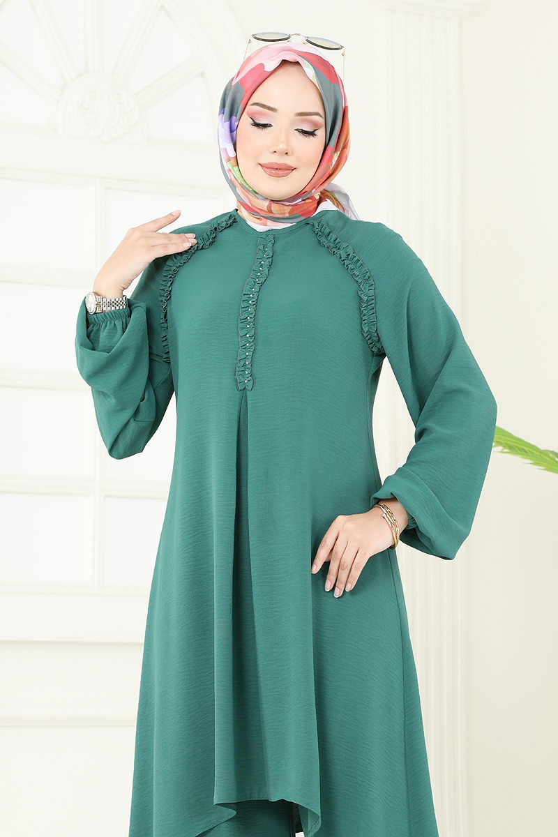 Ürün Özelliği : Yeni sezon tesettür moda ürünüdür. Sırttan kullanılabilir bir düğmesi bulunmaktadır. Ürün Bisiklet yakadır. Astarsızdır. Taşlar yapıştırmadır. Pantolon beli lastiklidir. Manşet lastiklidir. Konsept fotoğraf çekimlerinden dolayı üründe ton farklılığı olabilir.