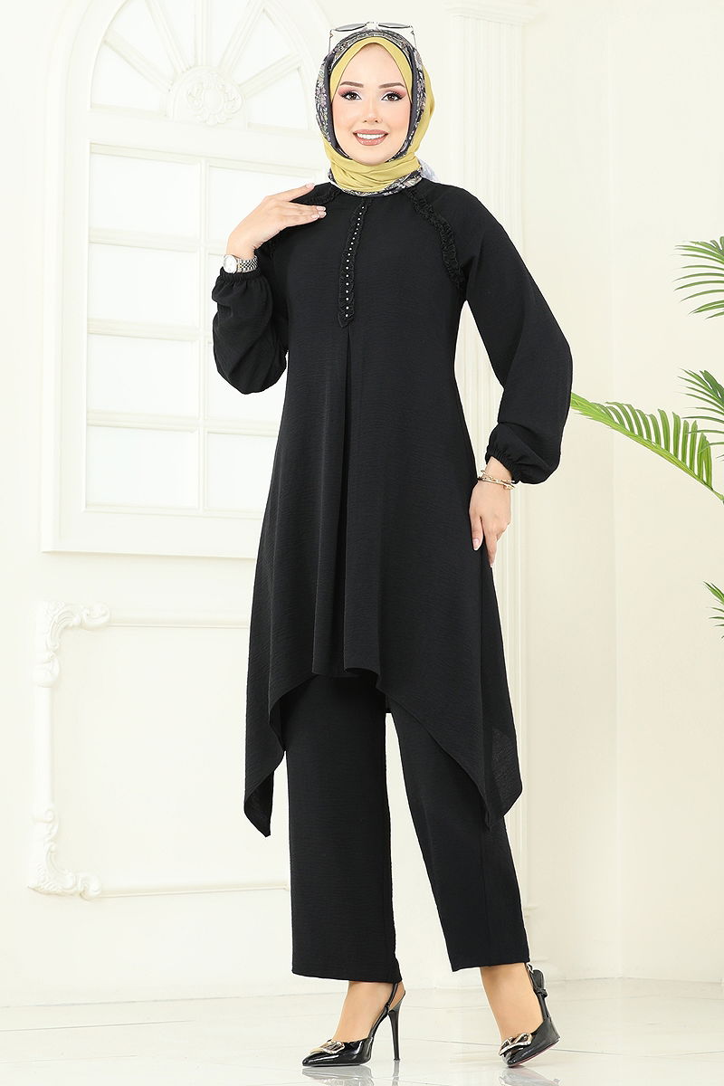 Ürün Özelliği : Yeni sezon tesettür moda ürünüdür. Sırttan kullanılabilir bir düğmesi bulunmaktadır. Ürün Bisiklet yakadır. Astarsızdır. Taşlar yapıştırmadır. Pantolon beli lastiklidir. Manşet lastiklidir. Konsept fotoğraf çekimlerinden dolayı üründe ton farklılığı olabilir.