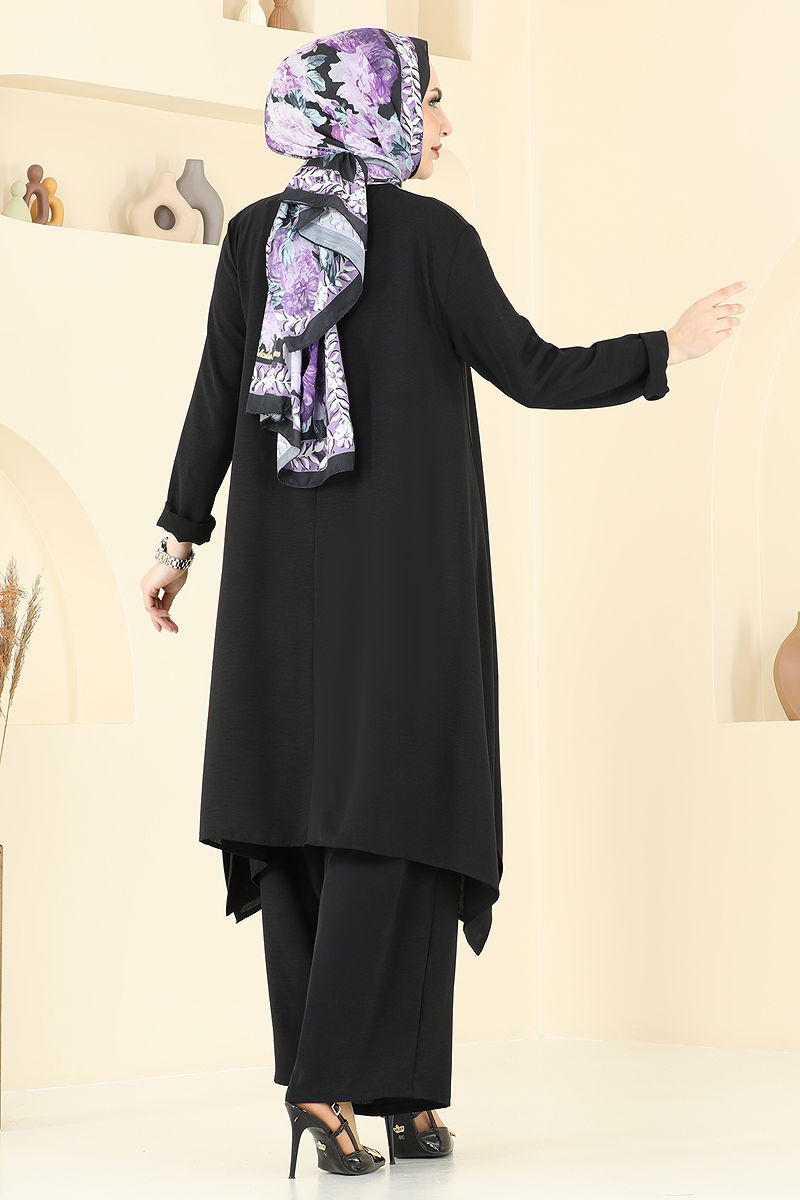 Yenilikçi ve şık bir seçim olan Asimetrik Kesim Kolyeli Takım, modern tesettür modasının zarif bir yansımasıdır. Dört mevsim rahatlıkla kullanabileceğiniz bu kombin, aerobin kumaşı sayesinde gün boyu rahatlık sunar. Hassas yıkama ile 30 derecede kolayca temizleyebilirsiniz. Tunik yandan yırtmaç detayına sahip olup, bisiklet yaka tasarımıyla modern bir görünüm kazandırır. Kolye, bu takımın şık bir tamamlayıcısı olarak dâhil edilmiş, ancak isteğe bağlı çıkarılabilir. Pantolonun elastik beli sayesinde gün boyu konfor sağlar. Hem şıklığı hem de konforu bir arada sunan bu takım, gardırop favorileriniz arasında hızla yerini alacak.