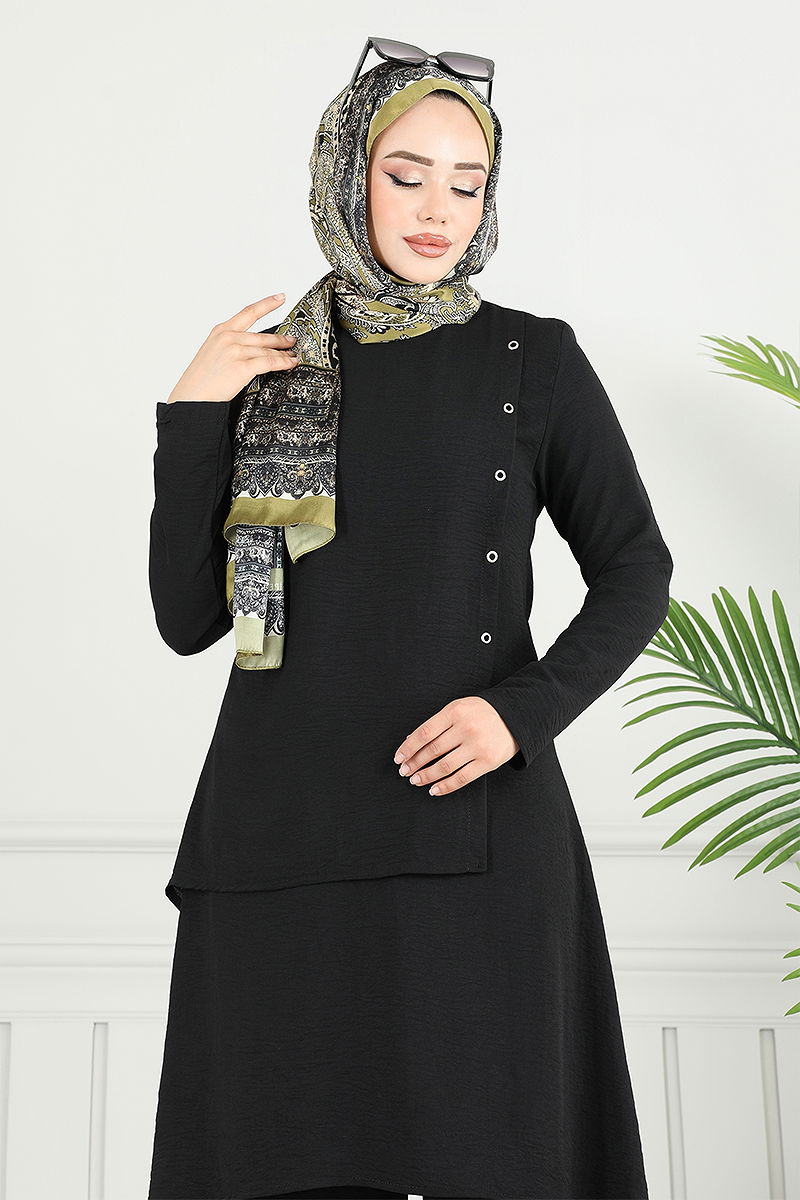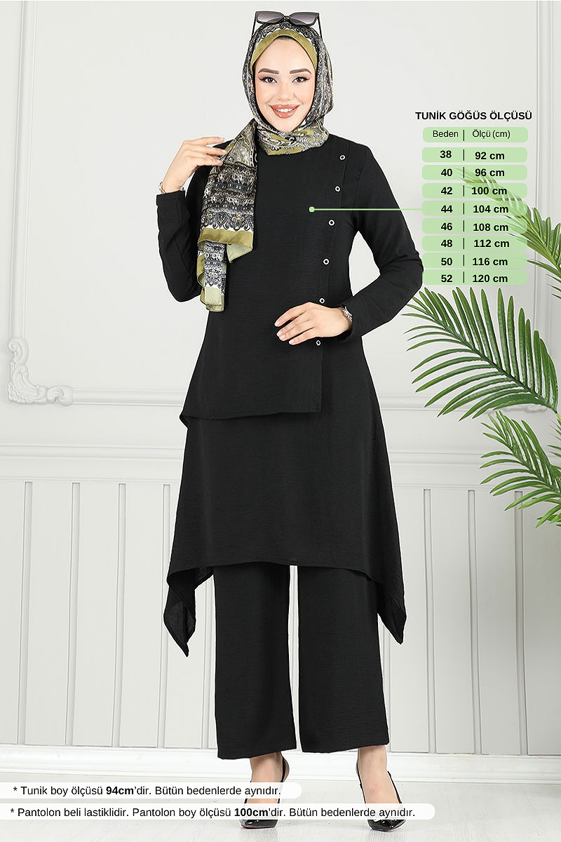 Ürün Özelliği : Yeni sezon tesettür moda ürünüdür. Sırttan kullanılabilir bir düğmesi bulunmaktadır. Ürün Bisiklet yakadır. Astarsızdır. Zımba detayları baskıdır. Pantolon beli lastiklidir. Konsept fotoğraf çekimlerinden dolayı üründe ton farklılığı olabilir.