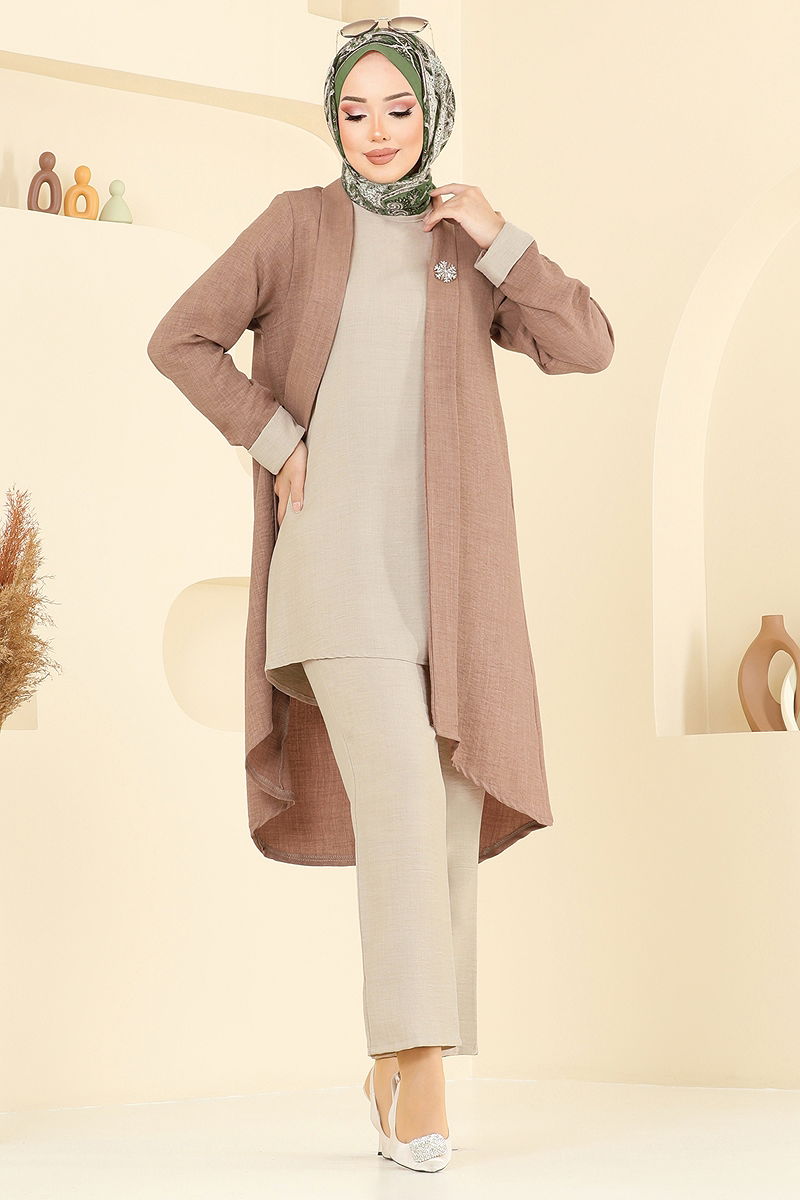 Asimetrik Kesim Üçlü Takım , sofia keten kumaştan üretilmiş olup, dört mevsim rahatlıkla kullanabileceğiniz şık bir tesettür ürünüdür. Üründe astarsız bisiklet yaka bulunmakta, iç tunik kolsuz olup, pantolonun beli lastiklidir. Hem şıklığı hem de konforu bir arada sunan bu takım, hassas yıkama ile 30 derecede yıkanabilir. Sırt kısmı pratik düğmeli tasarımı ile kolay kullanım imkanı sağlar. Mükemmel uyumu ve zarif tasarımı ile gardırobunuzun vazgeçilmezi olacak!