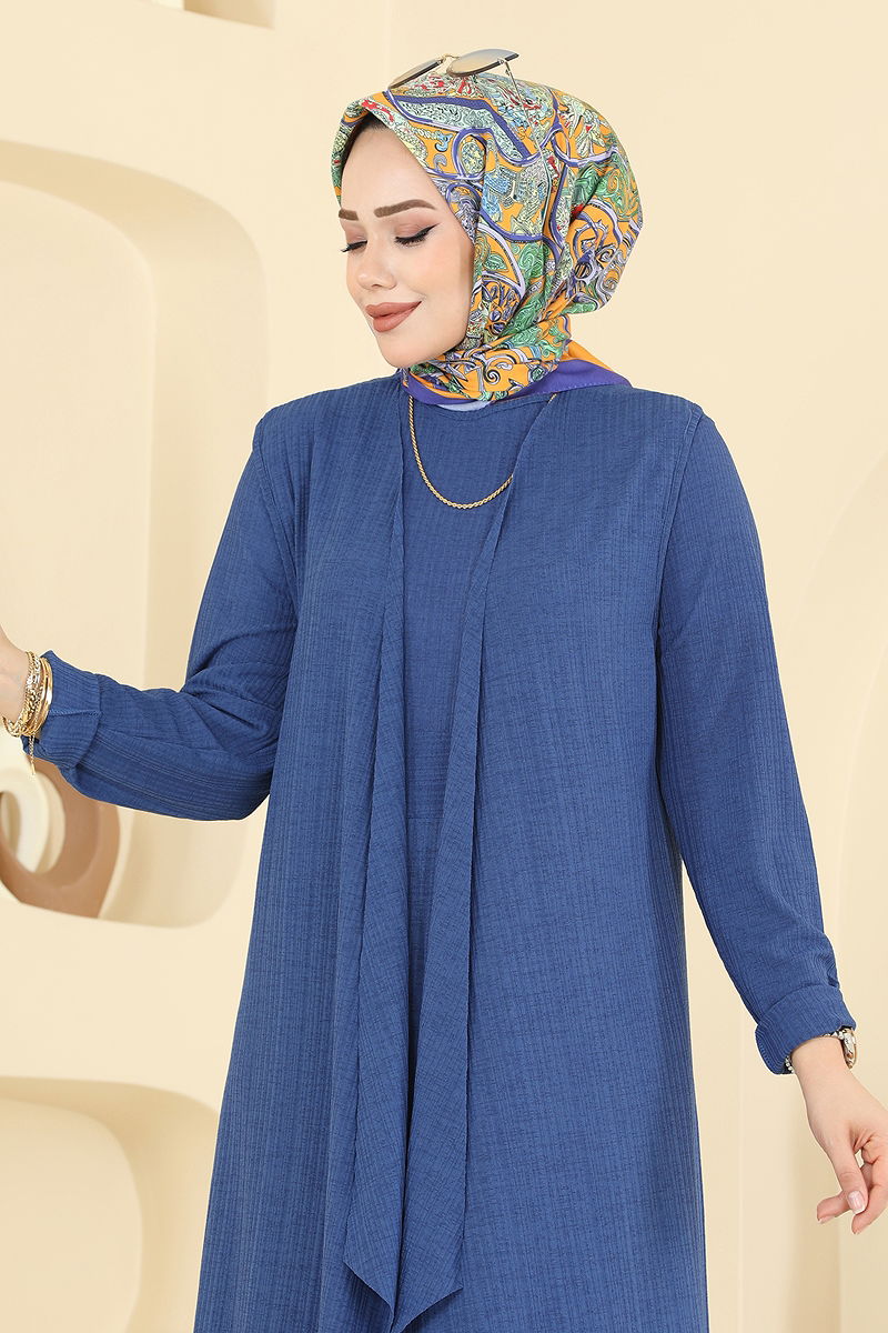Asimetrik Yelekli Örme Takım, tesettür tarzı için özel olarak tasarlanmıştır. Dört mevsim boyunca rahatlıkla kullanabileceğiniz bu takım, 30 derecede hassas yıkamaya uygundur. Bisiklet yakalı ve astarsız olan bu ürün, şıklığı konforla birleştiren tasarımıyla dikkat çekmektedir. Elbise uzun kollu olup, beli dikişlidir. Hem yelek hem de elbiseyi içeren bu kombine, gardırobunuzun vazgeçilmez bir parçası olmaya aday. Ürün bedeni olarak modelin üzerindeki 40 bedendir, farklı beden seçenekleriyle de temin edilebilir.