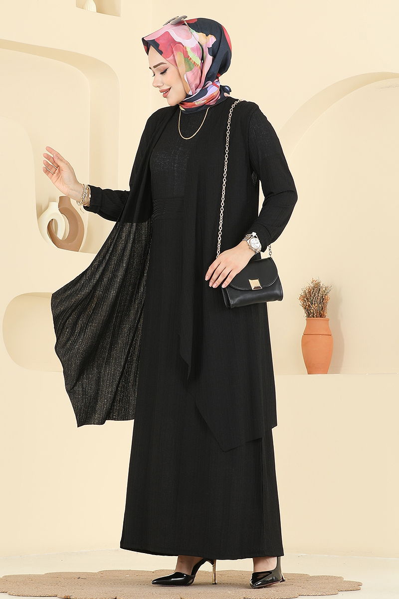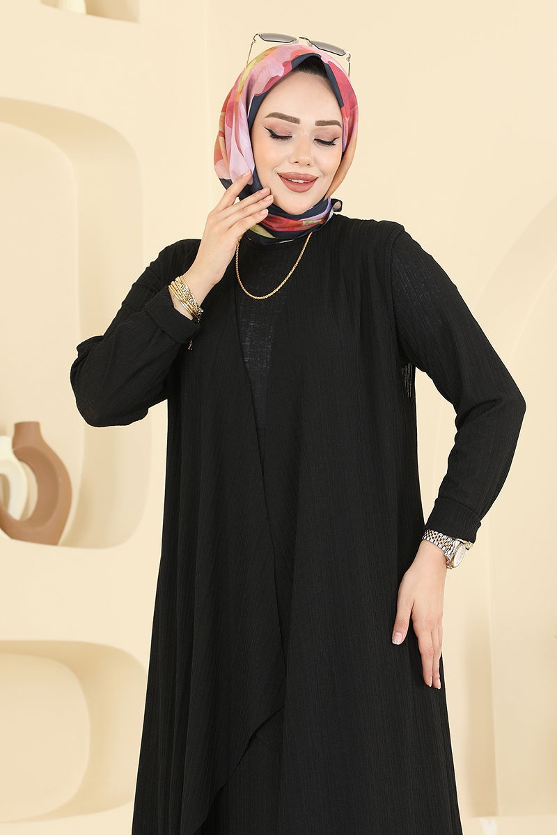 Asimetrik Yelekli Örme Takım, tesettür tarzı için özel olarak tasarlanmıştır. Dört mevsim boyunca rahatlıkla kullanabileceğiniz bu takım, 30 derecede hassas yıkamaya uygundur. Bisiklet yakalı ve astarsız olan bu ürün, şıklığı konforla birleştiren tasarımıyla dikkat çekmektedir. Elbise uzun kollu olup, beli dikişlidir. Hem yelek hem de elbiseyi içeren bu kombine, gardırobunuzun vazgeçilmez bir parçası olmaya aday. Ürün bedeni olarak modelin üzerindeki 40 bedendir, farklı beden seçenekleriyle de temin edilebilir.