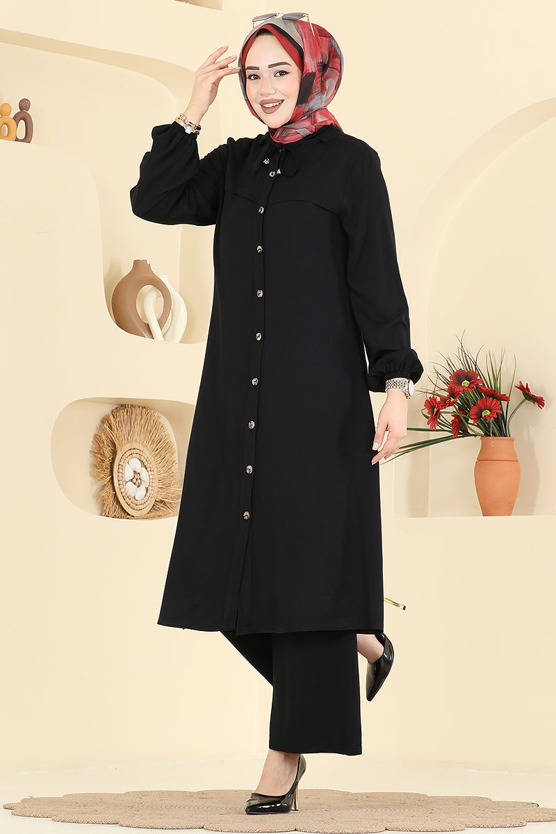 Bu şık Bağcık Detaylı 2'li Takım, tesettür giyinmeyi tercih eden hanımlar için idealdir. Dört mevsim rahatlıkla kullanabilirsiniz. Belmando kumaşı sayesinde uzun ömürlü ve konforludur. Yarım hakim yaka ve önden düğmeli tasarımı ile pratik bir kullanım sunar. Pantolonun beli lastikli olduğundan dolayı rahat bir oturuş sağlar. Tunik ve pantolon manşetleri de lastiklidir, bu sayede hareket özgürlüğü artar. Hassas yıkama programında 30 derecede yıkanabilir.