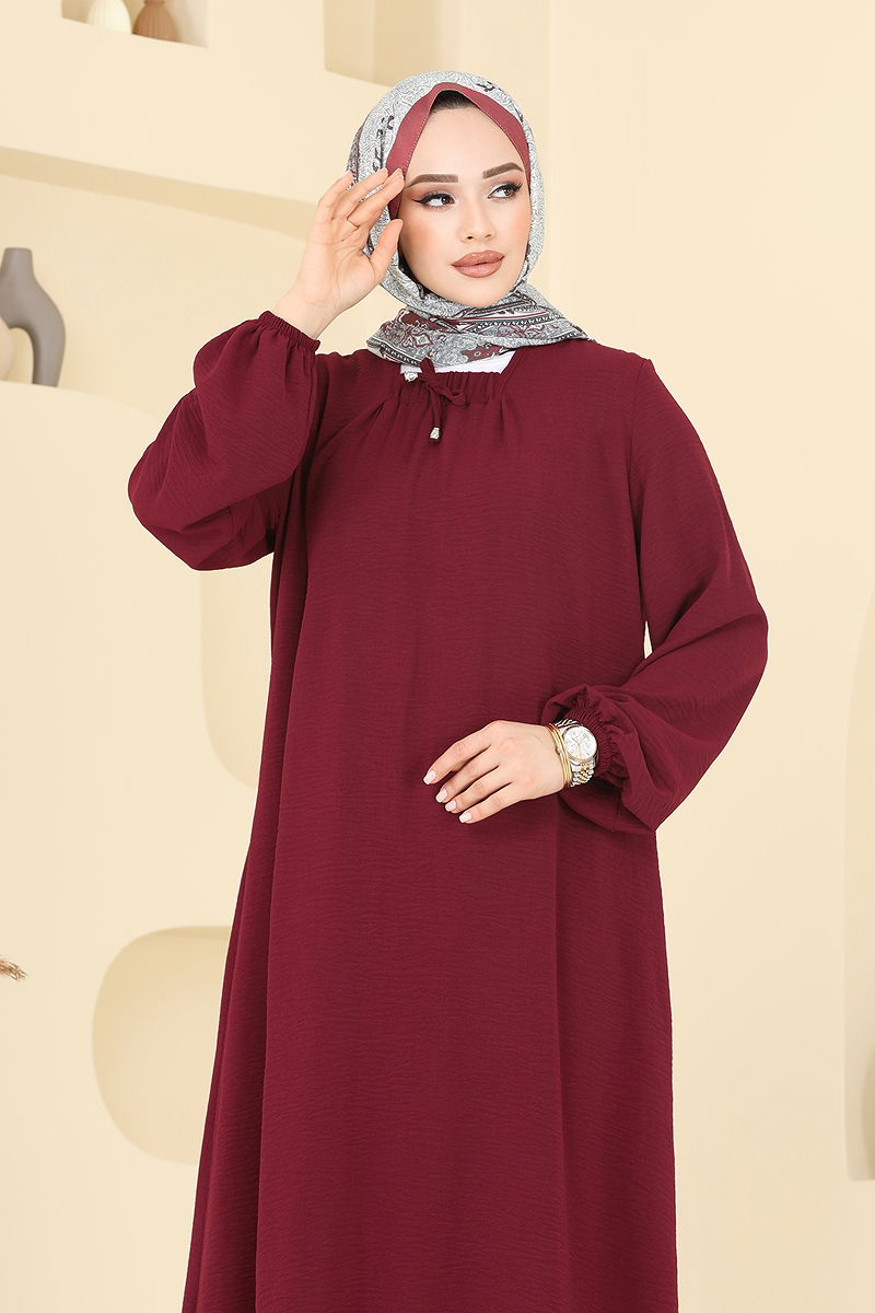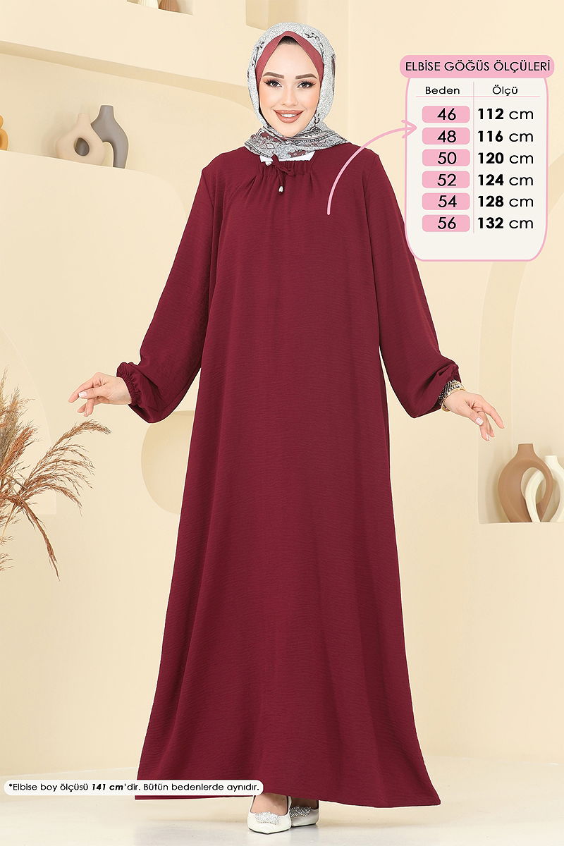 Şık ve estetik Bağcık Detaylı Aerobin Elbise, dört mevsim rahatlıkla giyilebilir. Hassas yapıdaki aerobin kumaşı, yıkanabilir özellikte olması ve dekoltesiz tasarımı ile muhafazakar giyim tarzını benimseyenler için ideal. Modelin üzerindeki 46 beden örneği ile sunduğu geniş beden skalası herkesi kucaklıyor. Manşetleri lastikli ve bağcık detayları ile şıklık katıyor.