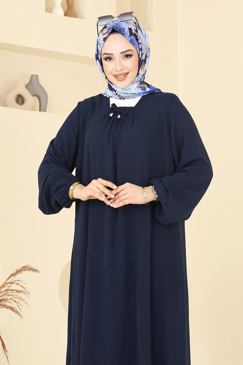 Şık ve estetik Bağcık Detaylı Aerobin Elbise, dört mevsim rahatlıkla giyilebilir. Hassas yapıdaki aerobin kumaşı, yıkanabilir özellikte olması ve dekoltesiz tasarımı ile muhafazakar giyim tarzını benimseyenler için ideal. Modelin üzerindeki 46 beden örneği ile sunduğu geniş beden skalası herkesi kucaklıyor. Manşetleri lastikli ve bağcık detayları ile şıklık katıyor.
