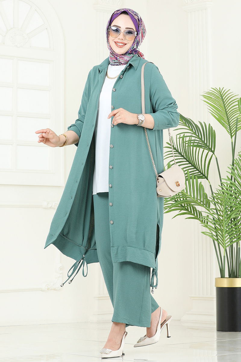 Ürün Özelliği : Yeni sezon tesettür moda ürünüdür. Ürün Gömlek yakadır. Ürün Önden düğmelidir. Tunik yandan yırtmaçlıdır.. Astarsızdır. Pantolon beli lastiklidir. Konsept fotoğraf çekimlerinden dolayı üründe ton farklılığı olabilir.