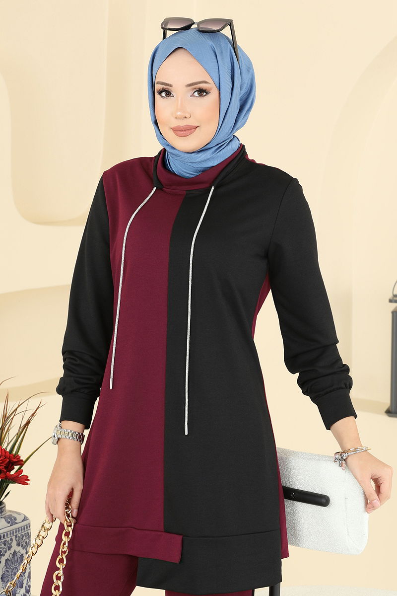 The Lace Detail Stone Suit KOMBİN model is a stylish hijab outfit suitable for all seasons. Its 30-degree washable feature ensures durability and care for delicate items. Made from vortex fabric, this set features a semi-high collar design that stands out. With its unlined structure, stone detailed laces, and an elastic waistband, it offers both comfort and elegance.