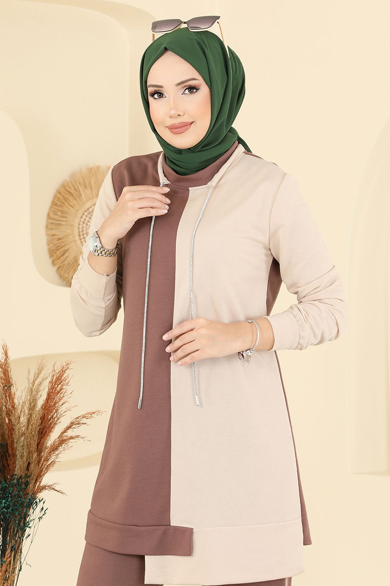 Bağcık Taş Detaylı Takım KOMBİN modeli, dört mevsim rahatlıkla kullanabileceğiniz şık bir tesettür ürünüdür. Hassas giysiler için önerilen 30 derecede yıkanabilme özelliği sayesinde, uzun ömürlü kullanım sunar. Vorteks kumaştan üretilmiş olan bu takım, yarım hakim yaka tasarımı ile dikkat çeker. Astarsız yapısı, taş detaylı bağcıkları ve lastikli pantolon beli ile hem rahat hem de şık bir görünüm sağlar.
