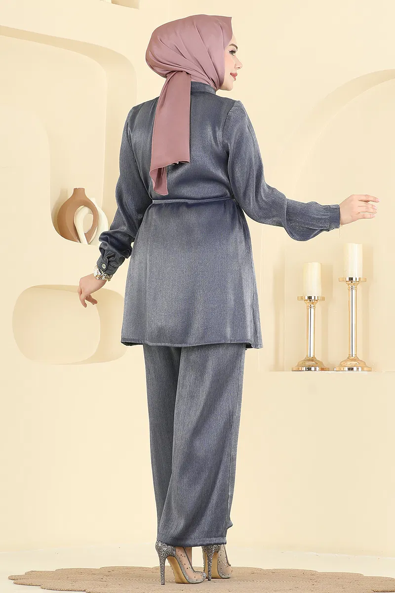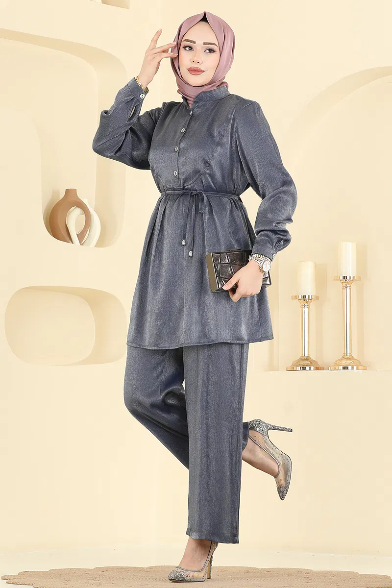 Bağcıklı Parlak Bürümcük Takım, dört mevsim boyunca şıklığınızı korumanızı sağlayacak bir tesettür kombinidir. 30 derecede hassas yıkama ile temizlenebilen bu ürün, parlak bürümcük kumaştan üretilmiştir. Yarım hakim yaka ve yarım düğmeli ön tasarıma sahip olan tunik, astarsızdır ve pantolonu ise rahat bir kullanım sunan lastik bel ve cebiyle tamamlanmaktadır. Bağcık aksesuarı ise isteğe bağlı olarak çıkarılabilir.