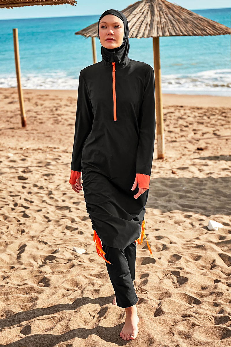 Product Feature : It is a new season hijab fashion product. The product has water repellent properties. When you get out of water, it dries quickly and does not stick to you. It has a front zipper that can be used. The product has a Judge collar. Unlined. The product has a stitched waistband. The product is lace-up. The bottom swimsuit is elastic. There may be a tonal difference in the product due to concept photo shoots.