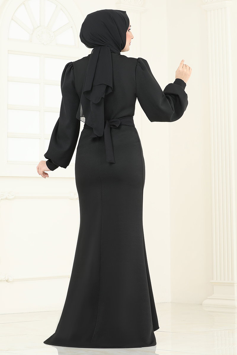 Balon Kollu Balık Abiye Siyah