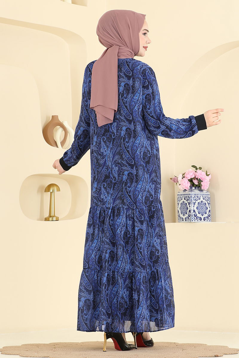 Ürün Adı: Baskı Detaylı Şifon Elbise. Bu şık tesettür elbise, her mevsim rahatlıkla kullanabileceğiniz özel bir tasarıma sahiptir. Kuru temizleme ile temizlenmesi gereken elbise, şifon kumaştan üretilmiş olup, bisiklet yaka ve esnek astar özelliklerine sahiptir. Baskı detayları ile göz alıcı bir görünüm sunar. Model üzerindeki ürün 38 bedendir.