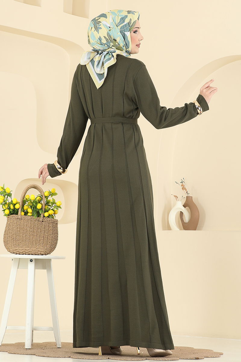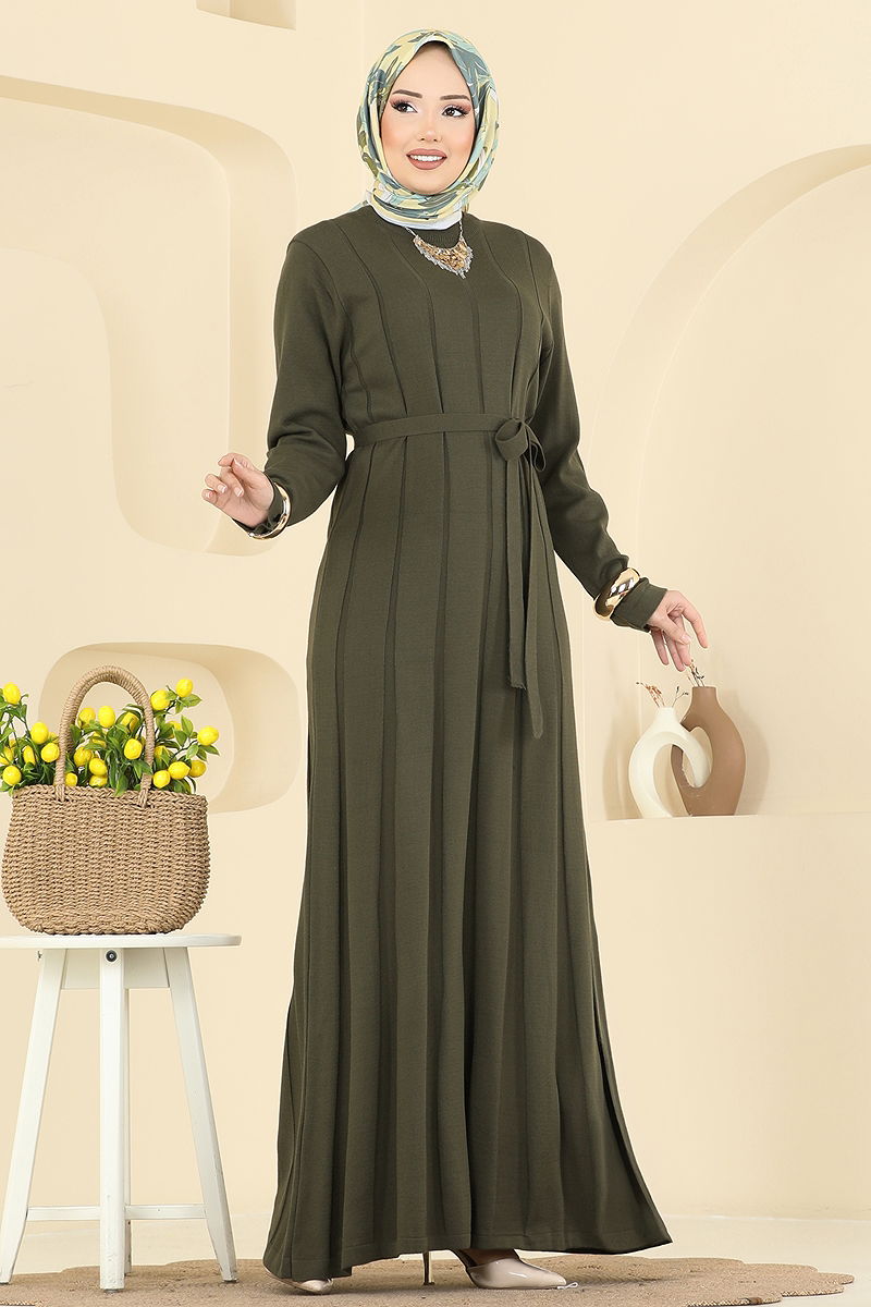 Beli Bağcık Detaylı Elbise Haki