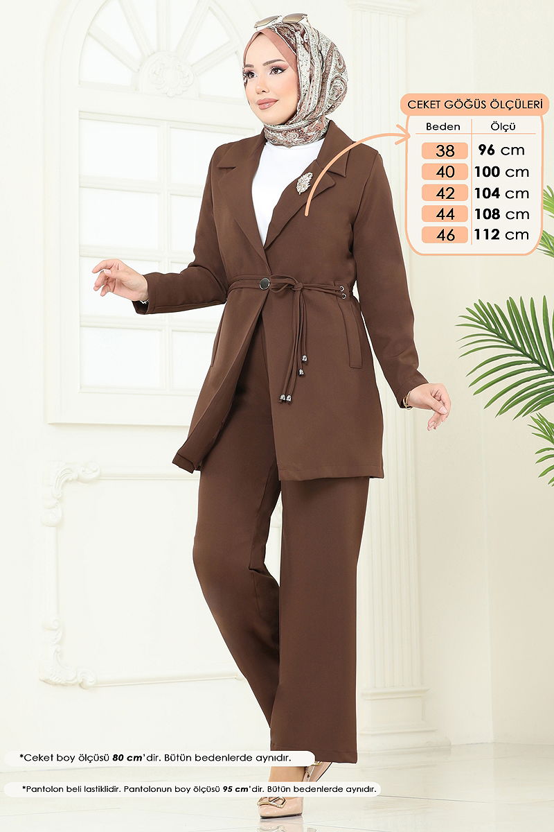 This stylish and modern Belted Jacket Suit is a perfect choice for women who prefer modest clothing. Suitable for all seasons, this suit is made from dabıl fabric that is safe for gentle washes at 30 degrees. It features a double-breasted design with a lined interior for combined comfort and elegance. The jacket's belted design ensures a flattering fit, while the pants have an elastic waistband for comfortable wear. This ensemble will provide an elegant appearance for any setting and become a staple in your wardrobe.