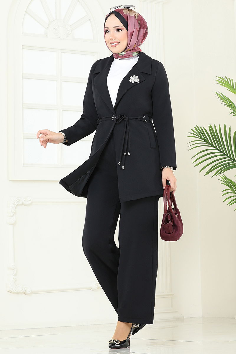 Bu şık ve modern Beli Bağcıklı Ceket Takım, tesettür giyim tercih eden kadınlar için mükemmel bir seçenektir. Dört mevsim rahatlıkla kullanabileceğiniz bu takım, 30 derecede hassas yıkamaya uygun dabıl kumaştan üretilmiştir. Kruvaze yakası ve astarlı yapısı ile konforu ve şıklığı bir arada sunar. önden kullanışlı bir düğmesi bulunan ceketin beli bağcıklı tasarımı, bedene uyum sağlar. Pantolonun bel kısmı lastikli olup rahat bir kullanım sunar. Her ortamda elegan bir görünüm sağlayan bu takım, dolabınızın vazgeçilmez parçaları arasında yerini alacak.
