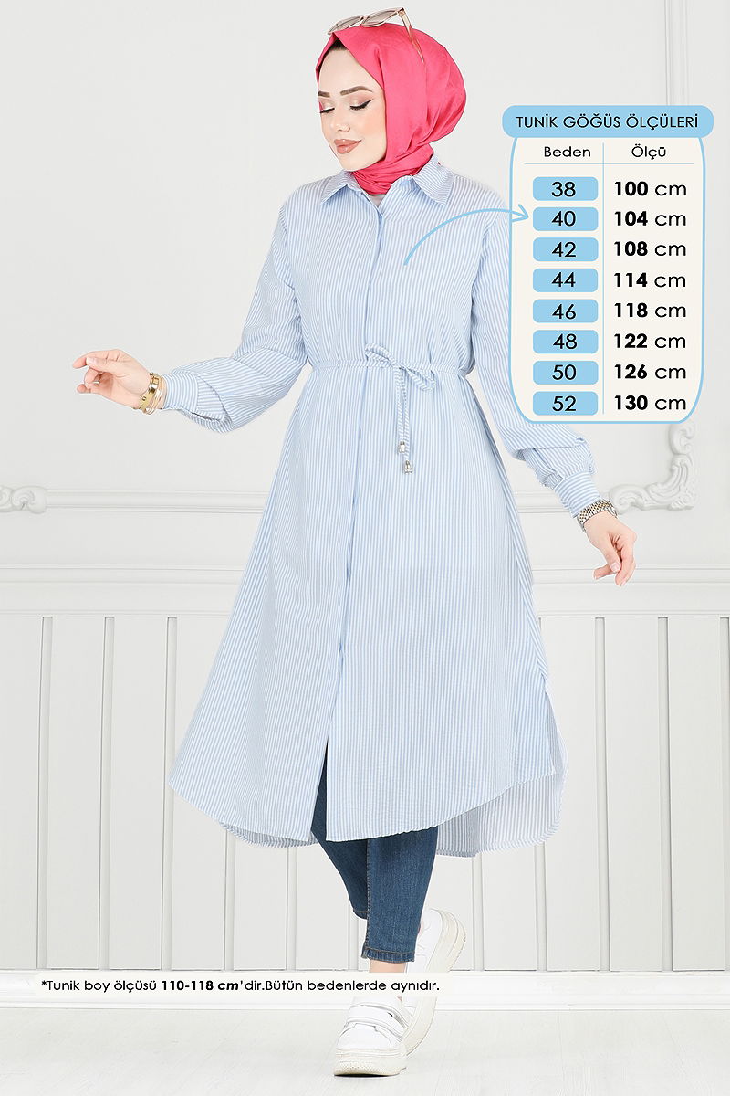 Offering both elegance and comfort, the Belted Striped Tunic can be used seamlessly throughout all seasons. Its delicate striped fabric makes it ideal for wear. Featuring a shirt collar and hidden button design, it boasts a modern look. Side slit details add dynamic flair to the tunic, while its unlined structure ensures maximum comfort. The included belt can be used optionally. This tunic is perfect for both everyday wear and special occasions.