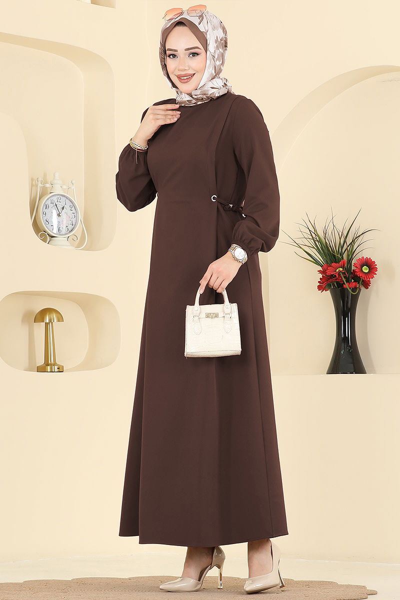 Beli Bağcıklı Dabıl Elbise Açık Kahve