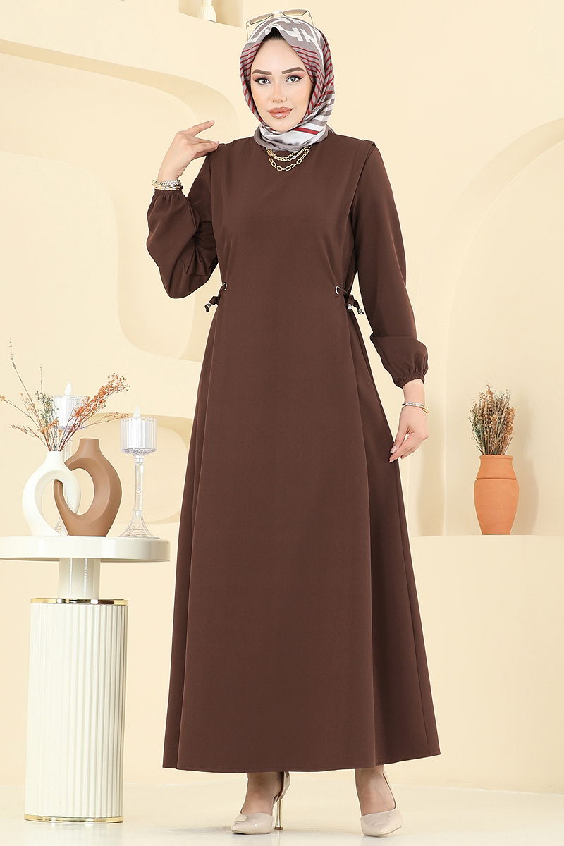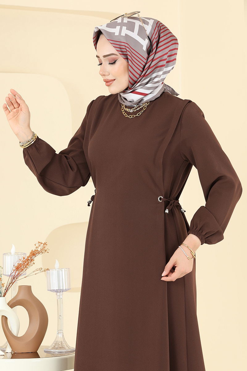 Beli Bağcıklı Dabıl Elbise, özel günlerinizde şıklığı yakalamak için tasarlanmıştır. Dört mevsim boyunca keyifle giyebileceğiniz bu elbise, dabıl kumaştan üretilmiş olup, sıcak günlerde bile rahat ettirecek şekilde nefes alabilir bir yapıya sahiptir. Hassas yıkama özelliği sayesinde uzun ömürlü kullanım sunar. Bisiklet yaka tasarımı ve astarsız yapısı ile konforu ön planda tutar. Beli bağcıklı tasarımı sayesinde farklı vücut tiplerine uyum sağlar ve şık bir görünüm kazandırır. Beli ve manşetleri lastikli olduğundan, hem şık hem de pratik bir kullanım vaat eder.