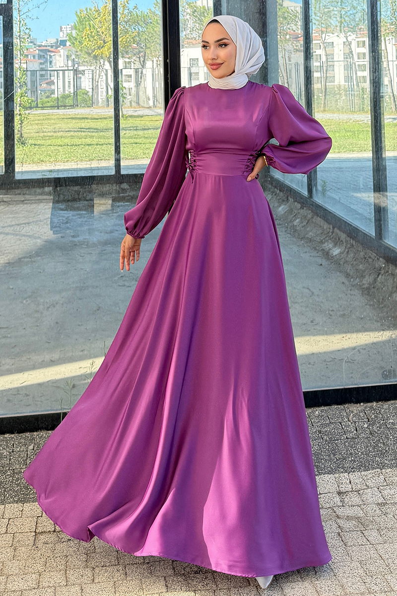Beli Bağcıklı Saten Abiye Koyu Lila