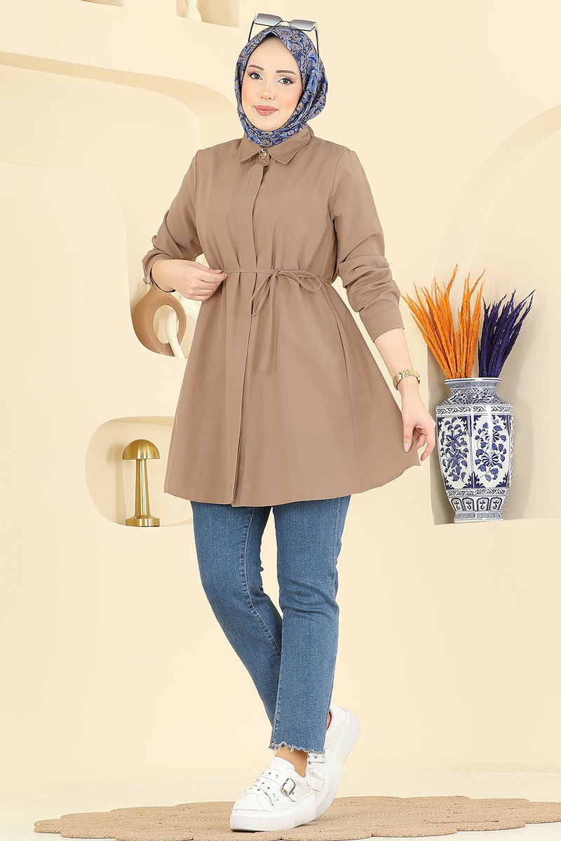 Beli Bağcıklı Terikoton Gömlek 3077KTR750 Latte