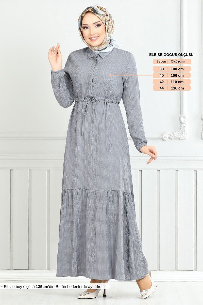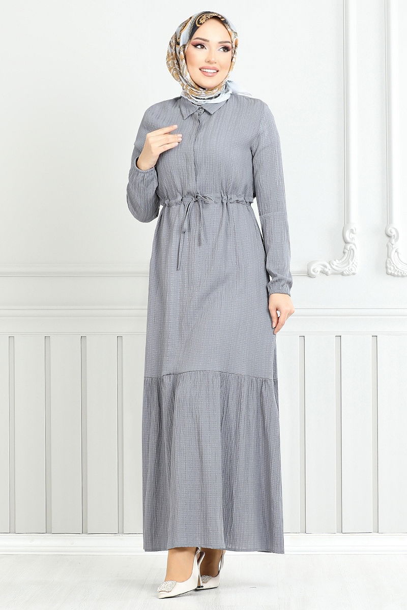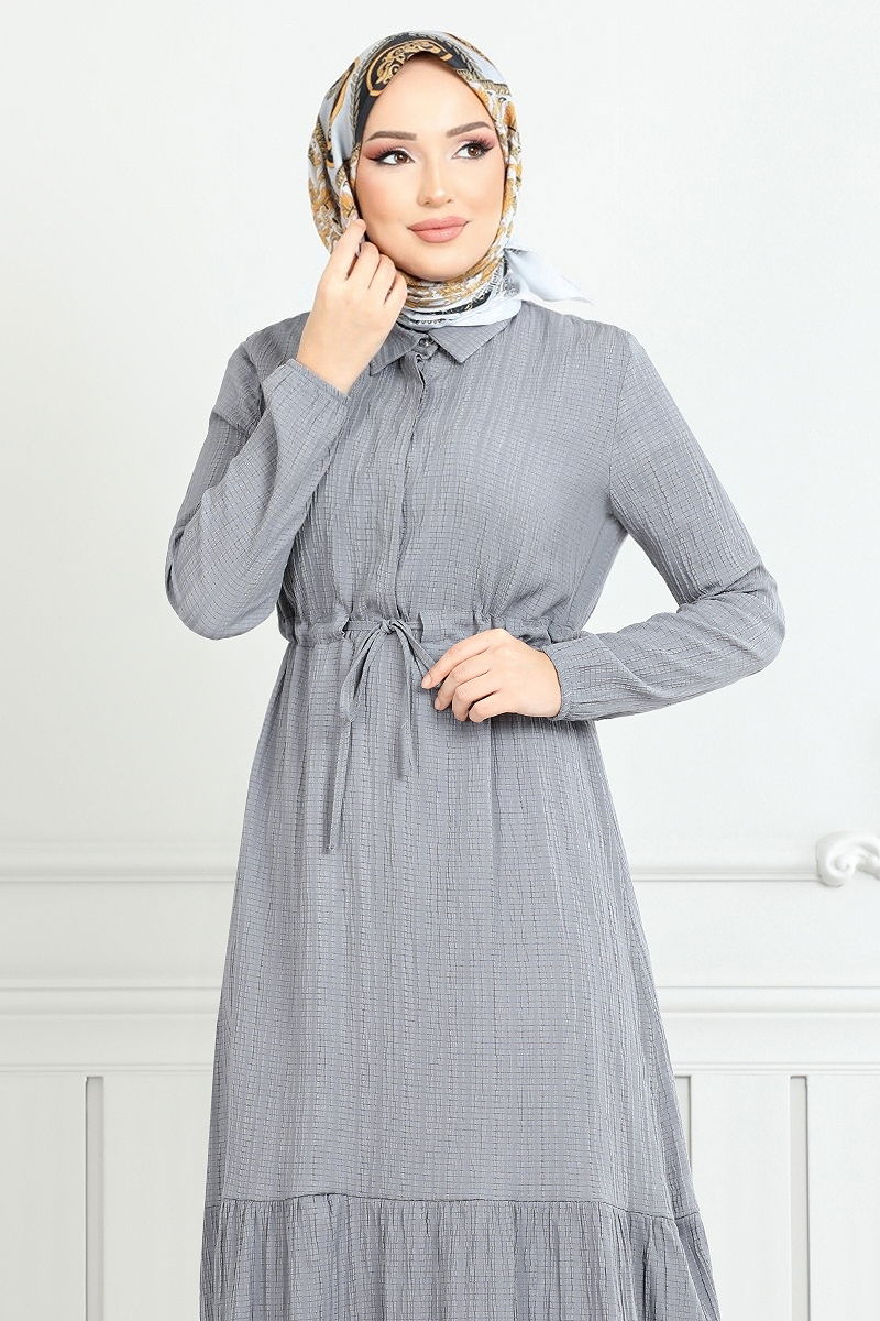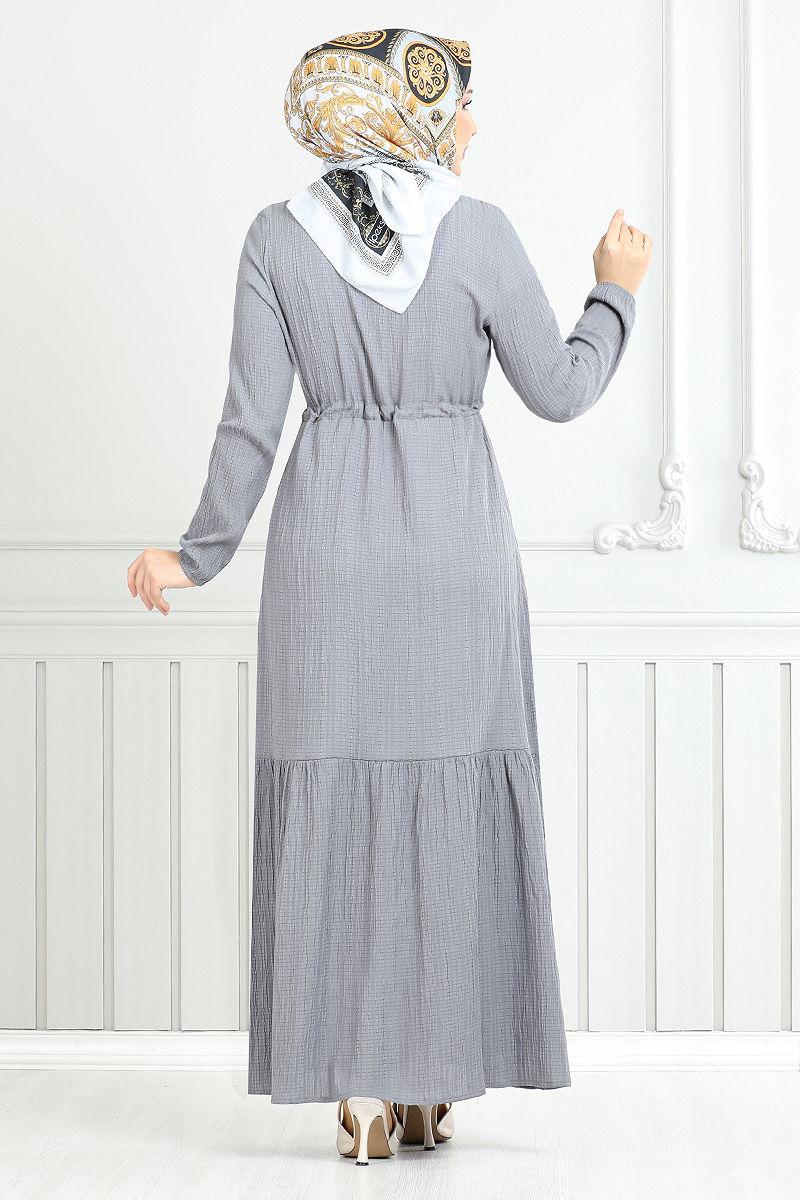 Beli Bağcıklı Tesettür Elbise 779ASE1099-M Gri