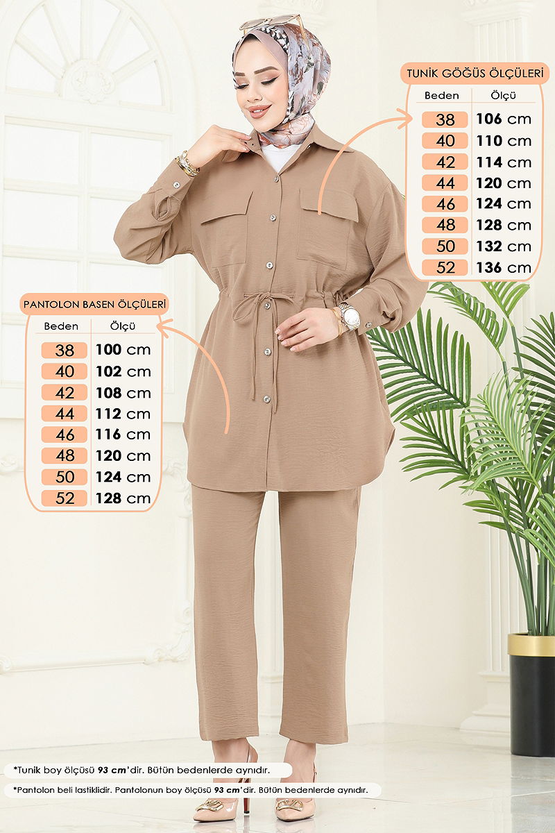 Beli Bağcıklı Aerobin Takım , dört mevsim rahatlıkla kullanılabilen modern bir tesettür ürünüdür. Hassas yıkama önerilen bu takım, 30 derecede yıkanabilir ve aerobin kumaştan üretilmiştir. Ürün önden düğmeli olup astarsızdır. Beli bağcıklı tunik ve lastik bel pantolonu ile konforlu bir kullanım sunar. Her iki parçada da cep bulunmakta ve manşet düğmeleri aktif olarak kullanılabilir. Modelin ölçüleri: Boy: 165 cm, Göğüs: 88 cm, Bel: 68 cm, Basen: 99 cm, Kilo: 56 kg.