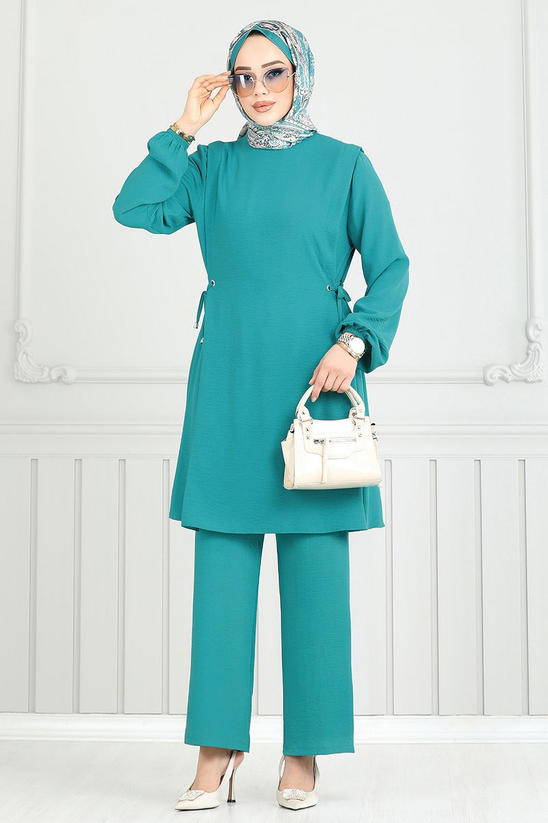 Beli Bağcıklı Tesettür Takım Açık Petrol