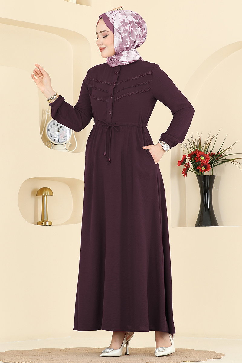 Beli Bağcıklı Uzun Elbise 6147ORG1169 Mürdüm