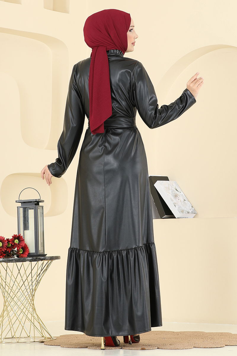 Yeni sezonun gözdesi Beli Kemerli Deri Elbise ile stilinizi bir adım öne taşıyın! Tesettür tasarımı, deri detayları ve yarım hakim yaka bu elbiseyi benzersiz kılar. Sonbahar ve Kış aylarında tercih edebileceğiniz bu ürün, sadece kuru temizleme ile bakım gerektirir. Fermuarlı sırt ve dikişli bel tasarımı ile konfor ve şıklığı bir arada sunar. Kemerin dalgalanmasını önleyen özel dikim teknikleriyle tasarlanmıştır, kemer isteğe bağlı olarak çıkarılabilir.