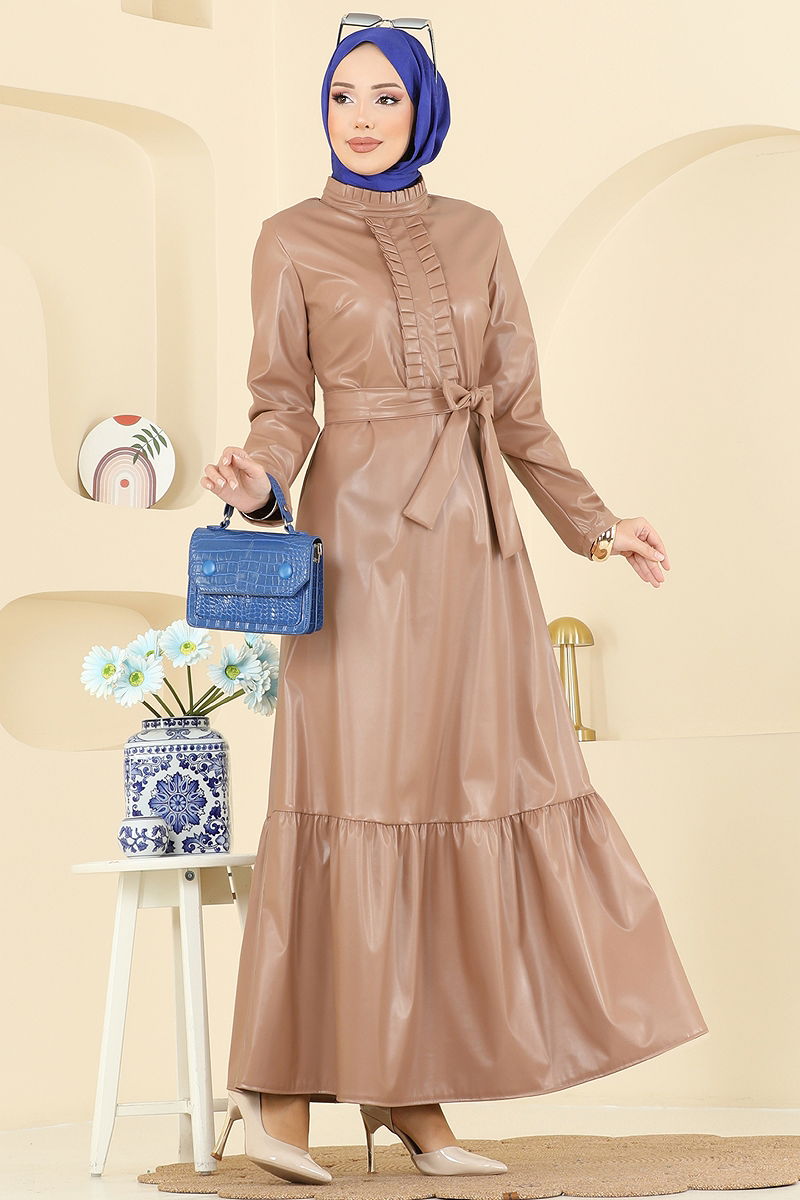 Yeni sezonun gözdesi Beli Kemerli Deri Elbise ile stilinizi bir adım öne taşıyın! Tesettür tasarımı, deri detayları ve yarım hakim yaka bu elbiseyi benzersiz kılar. Sonbahar ve Kış aylarında tercih edebileceğiniz bu ürün, sadece kuru temizleme ile bakım gerektirir. Fermuarlı sırt ve dikişli bel tasarımı ile konfor ve şıklığı bir arada sunar. Kemerin dalgalanmasını önleyen özel dikim teknikleriyle tasarlanmıştır, kemer isteğe bağlı olarak çıkarılabilir.