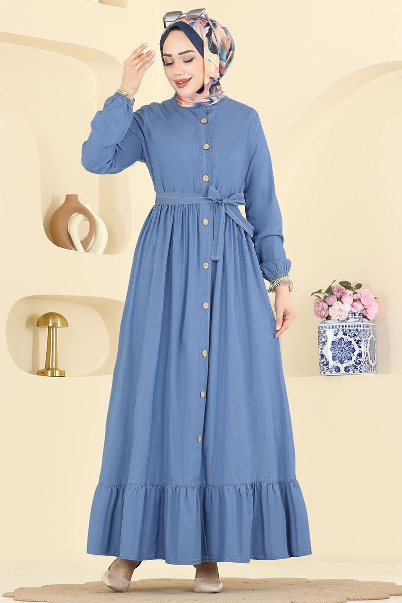 Şık ve fonksiyonel tasarımıyla dikkat çeken Beli Kemerli Kot Elbise, tesettür giyimde modern bir dokunuş sunuyor. Dört mevsim rahatlıkla giyebileceğiniz bu elbise, hassas ayar 30 derecede yıkanabilir özelliğiyle pratik bir kullanım sağlar. Yarım hakim yaka ve önden düğmeli tasarımı ile zarif bir görünüm sunarken, astarsız yapısıyla hafif ve rahat bir kullanım vaat eder. Beli dikişli ve kemerli tasarımı sayesinde feminen bir siluet ortaya çıkarır. Manşetleri lastikli olan bu elbise, hem şık hem de konforlu bir seçimdir.