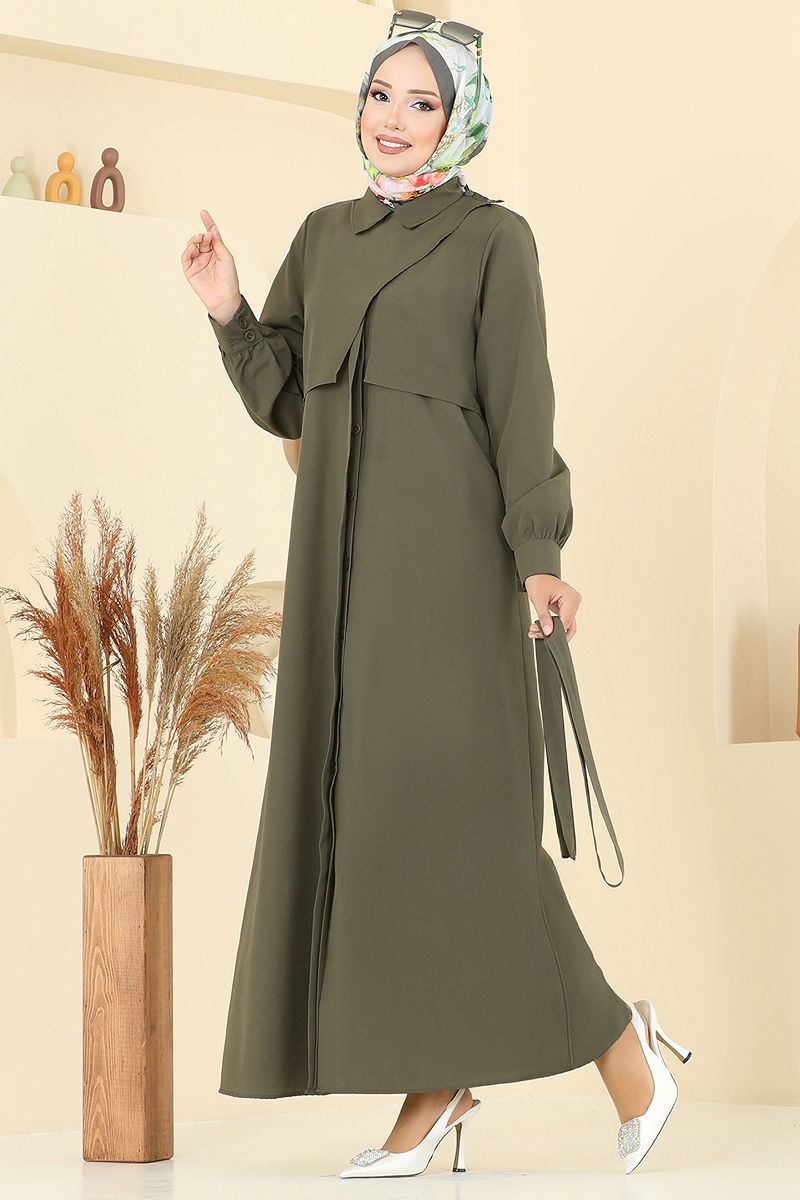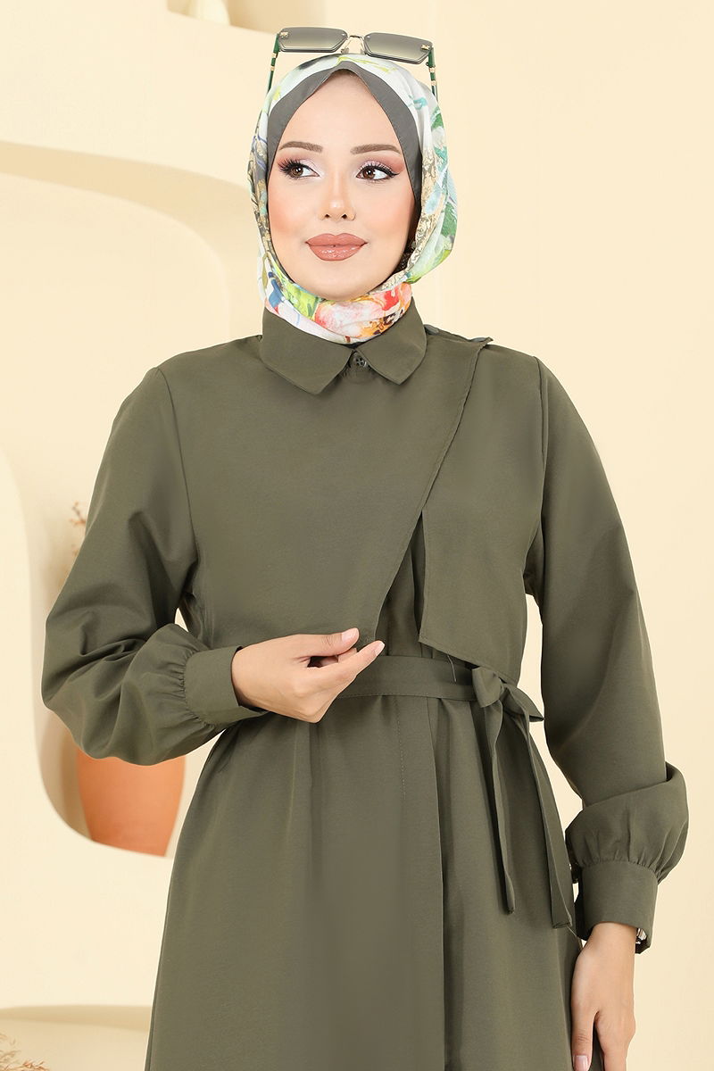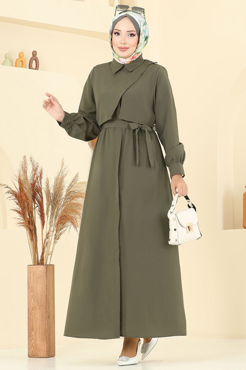 Beli Kuşaklı Elbise Ferace Haki