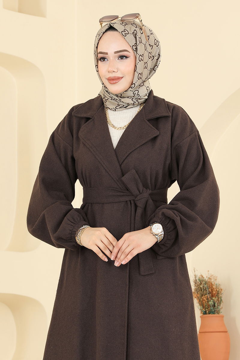 Beli Kuşaklı Kaşe Kaban Kahve
