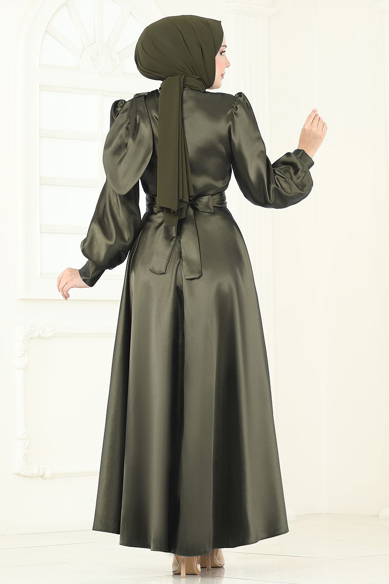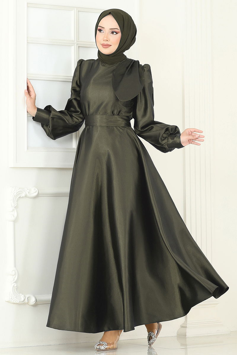 This elegant Belted Satin Evening Dress is specially designed for women who embrace the hijab fashion style. Suitable for use across all four seasons, this product is perfect for any special occasion. Made from high-quality satin fabric, the dress should only be dry cleaned. It features a zipper at the back for a graceful fit. The model is designed with a height of 165 cm, chest of 80 cm, waist of 68 cm, hips of 96 cm, and weighs 54 kg.