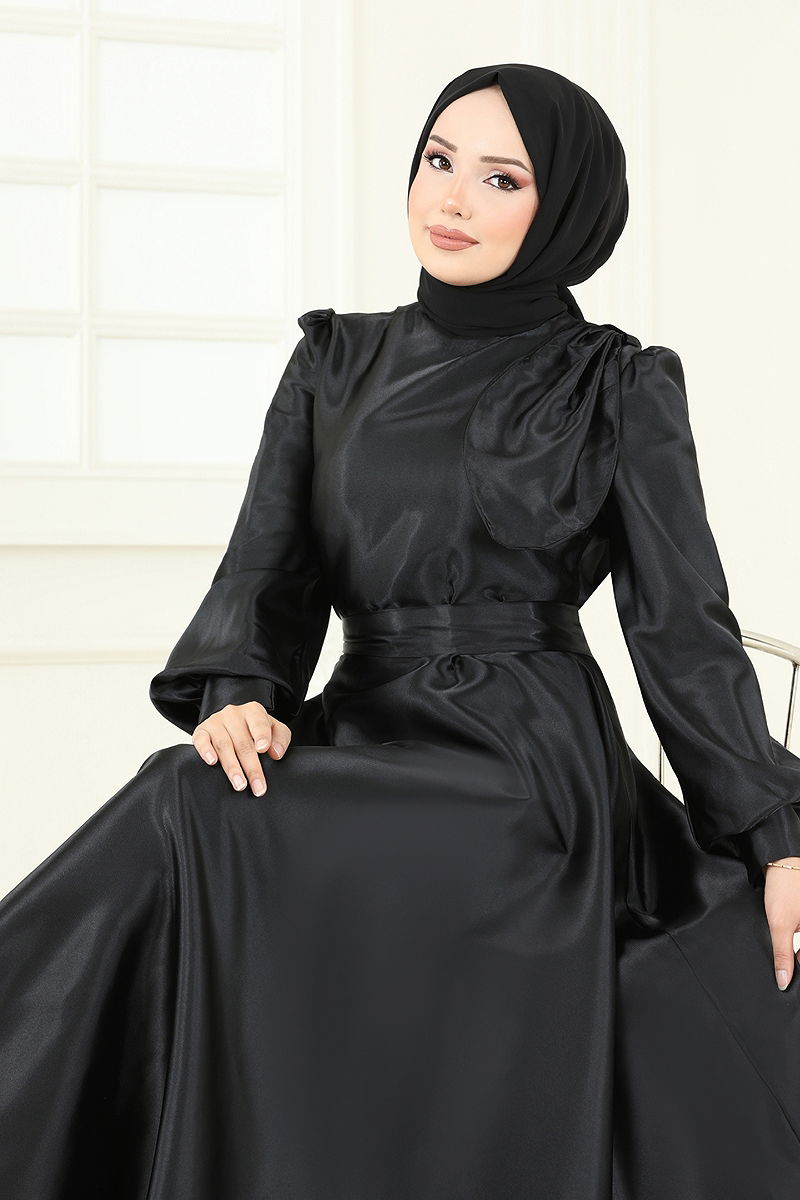 This elegant Belted Satin Evening Dress is specially designed for women who embrace the hijab fashion style. Suitable for use across all four seasons, this product is perfect for any special occasion. Made from high-quality satin fabric, the dress should only be dry cleaned. It features a zipper at the back for a graceful fit. The model is designed with a height of 165 cm, chest of 80 cm, waist of 68 cm, hips of 96 cm, and weighs 54 kg.